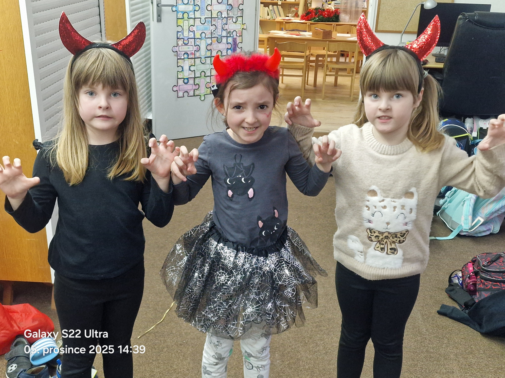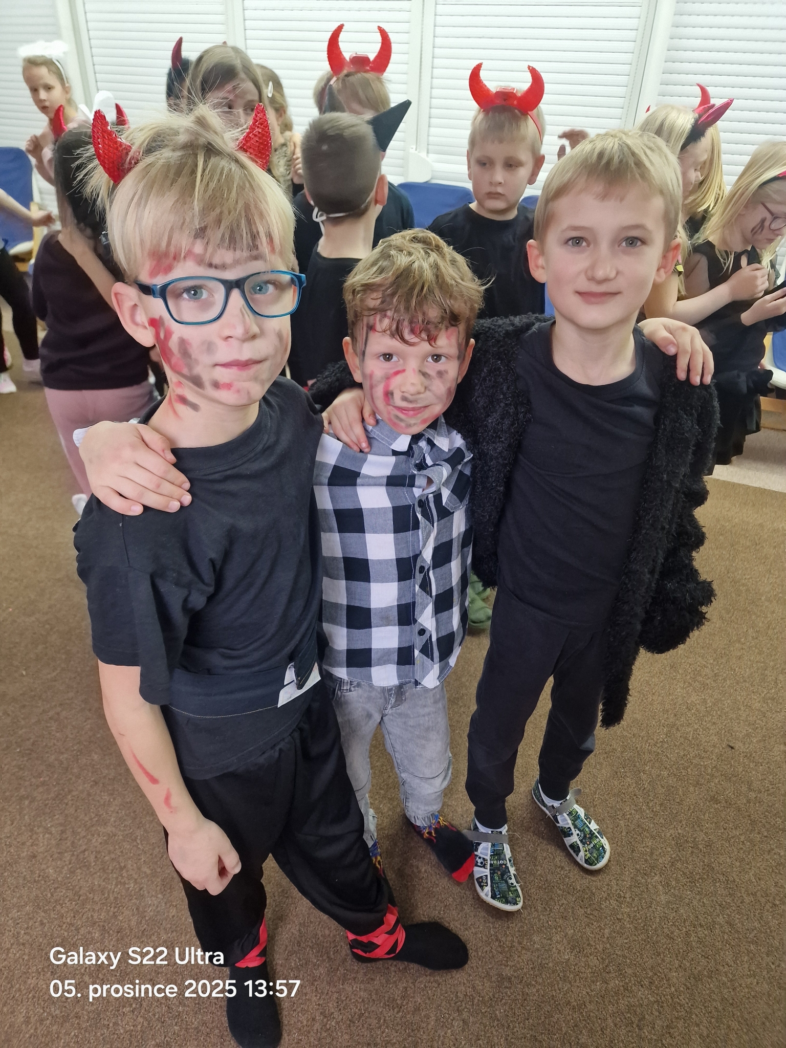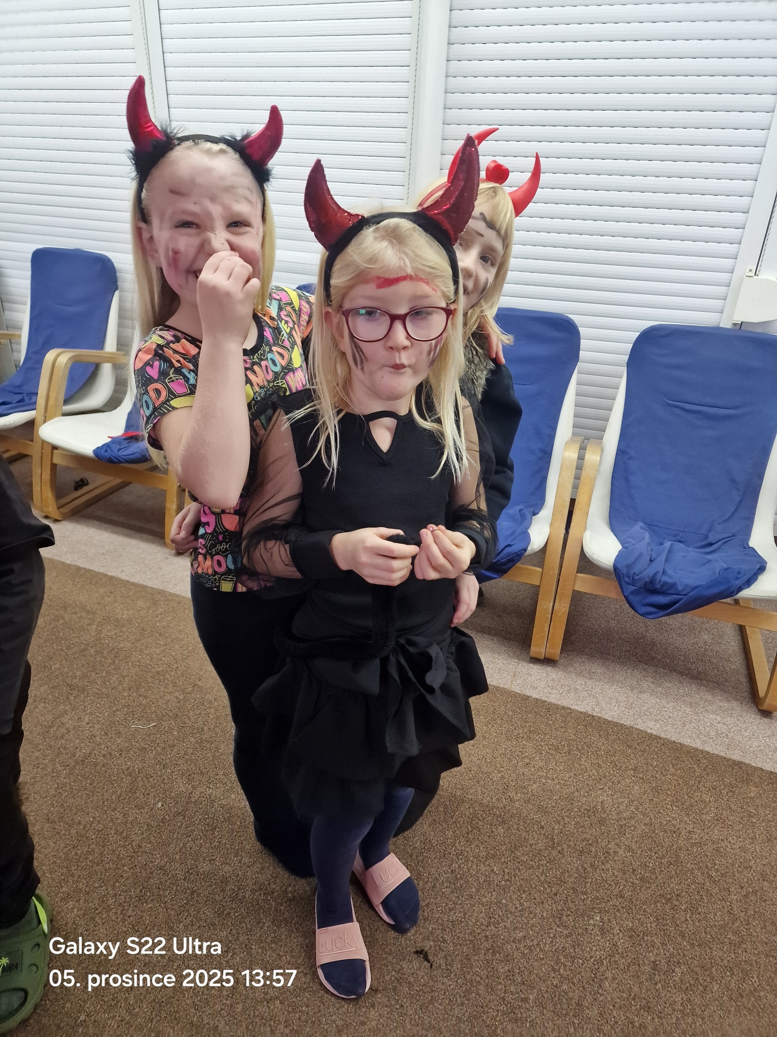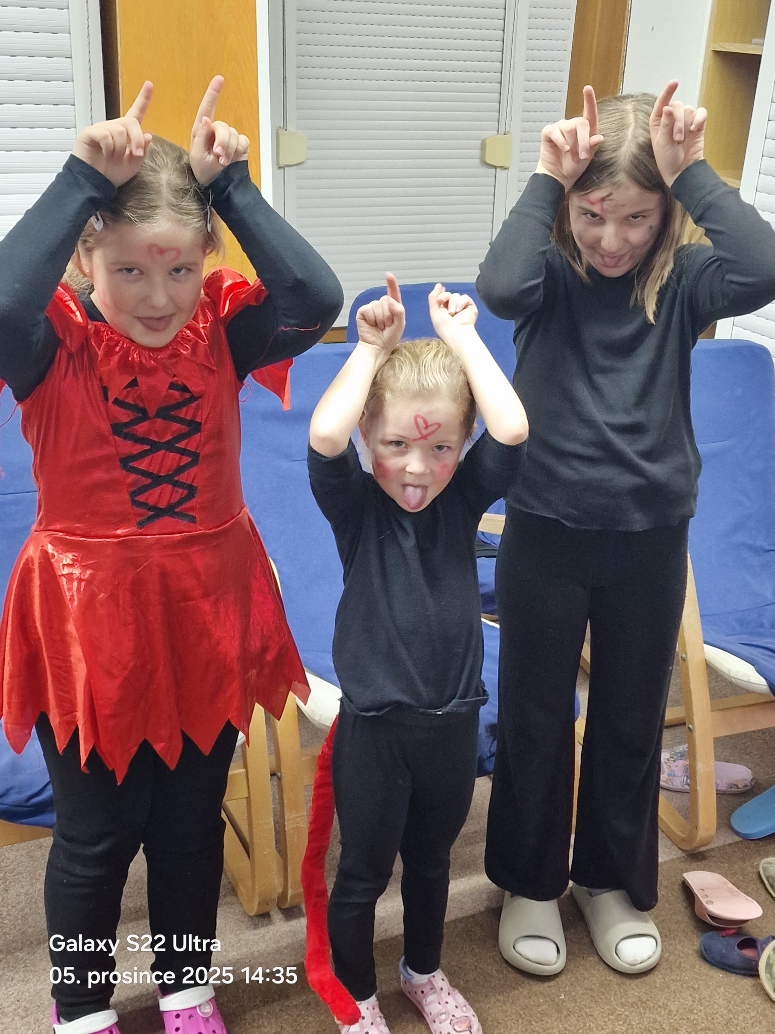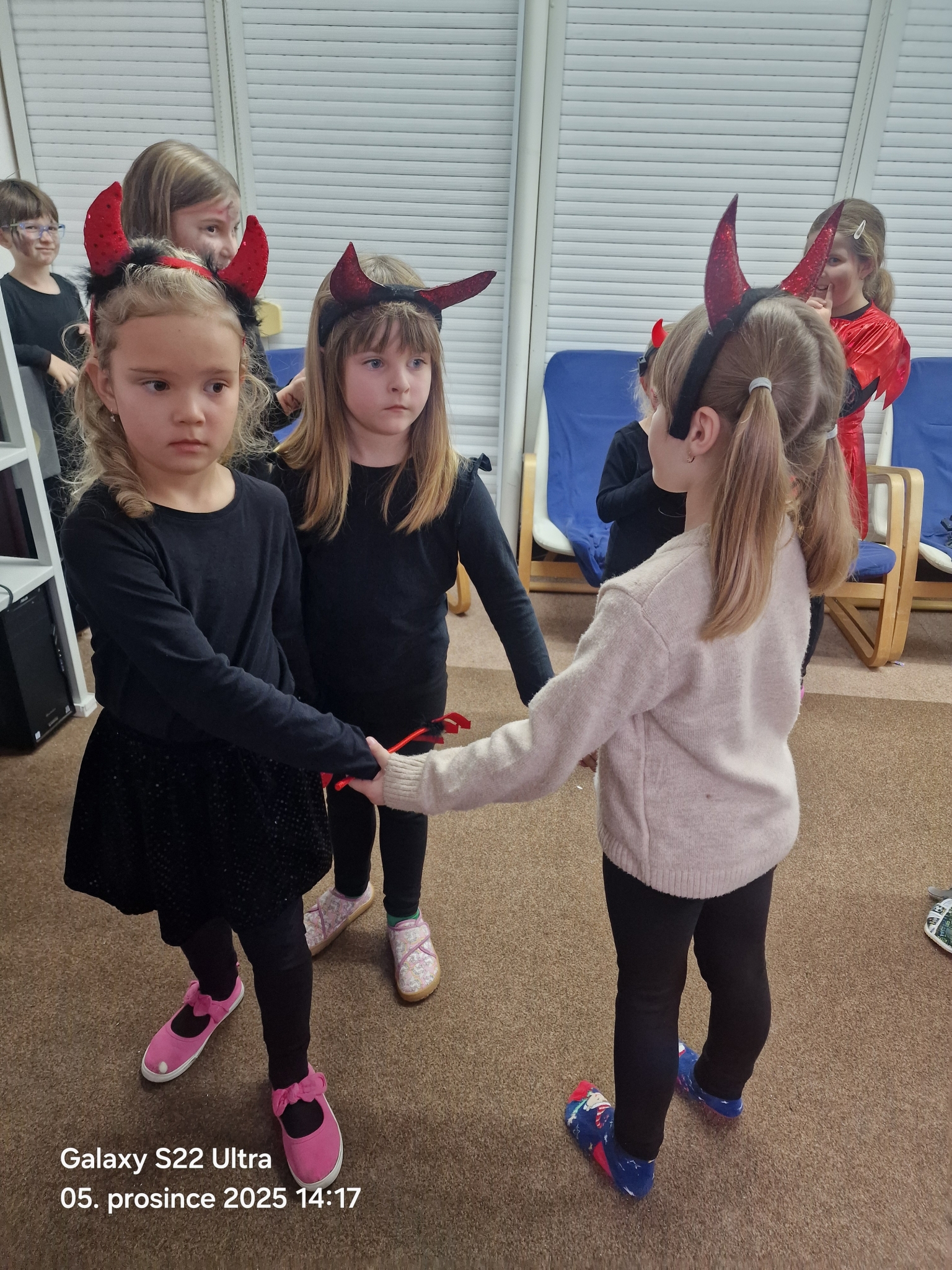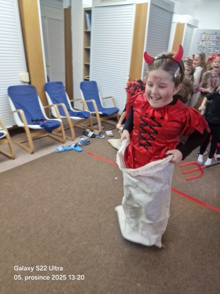 Odpoledne se děti sešly v družině, kde na ně čekal pořádný čertovský rej. Hned na úvod se představili malí čertíci se svými originálními čertovskými jmény, která si pro tuto příležitost připravili. Následovaly soutěže - skákání v pytli, které s "kopýtky" zvládli levou zadní, volba nejkrásnějšího čertího obličeje a mnoho dalších her, při nichž nechyběl pohyb, smích a pořádná porce zábavy.