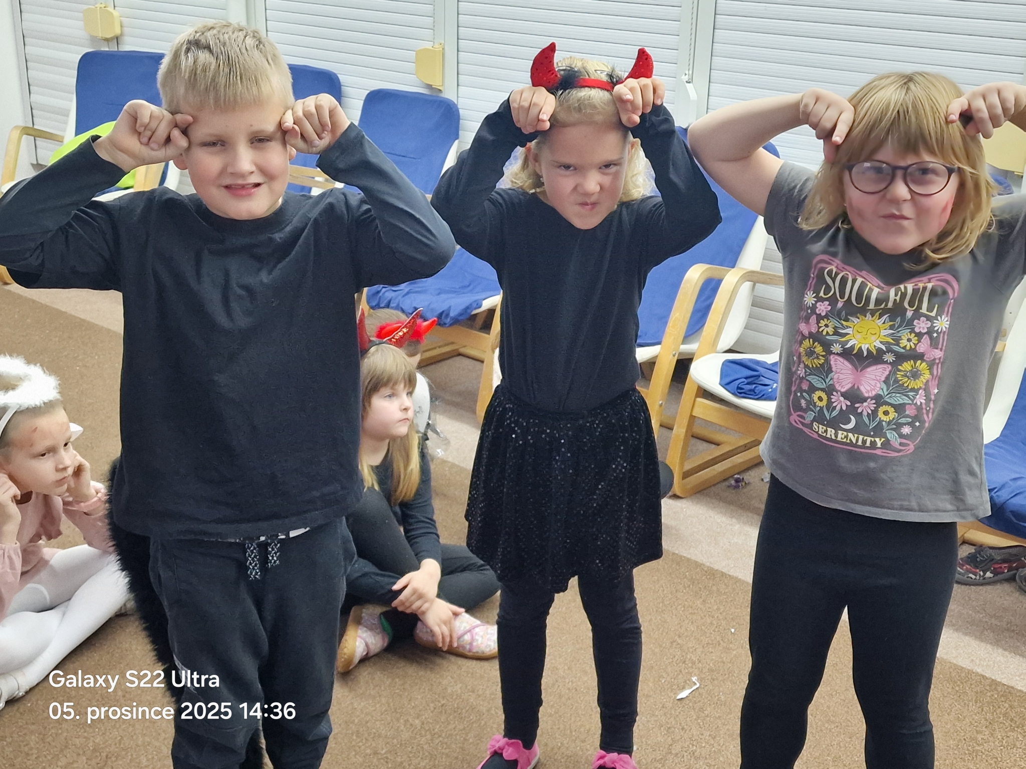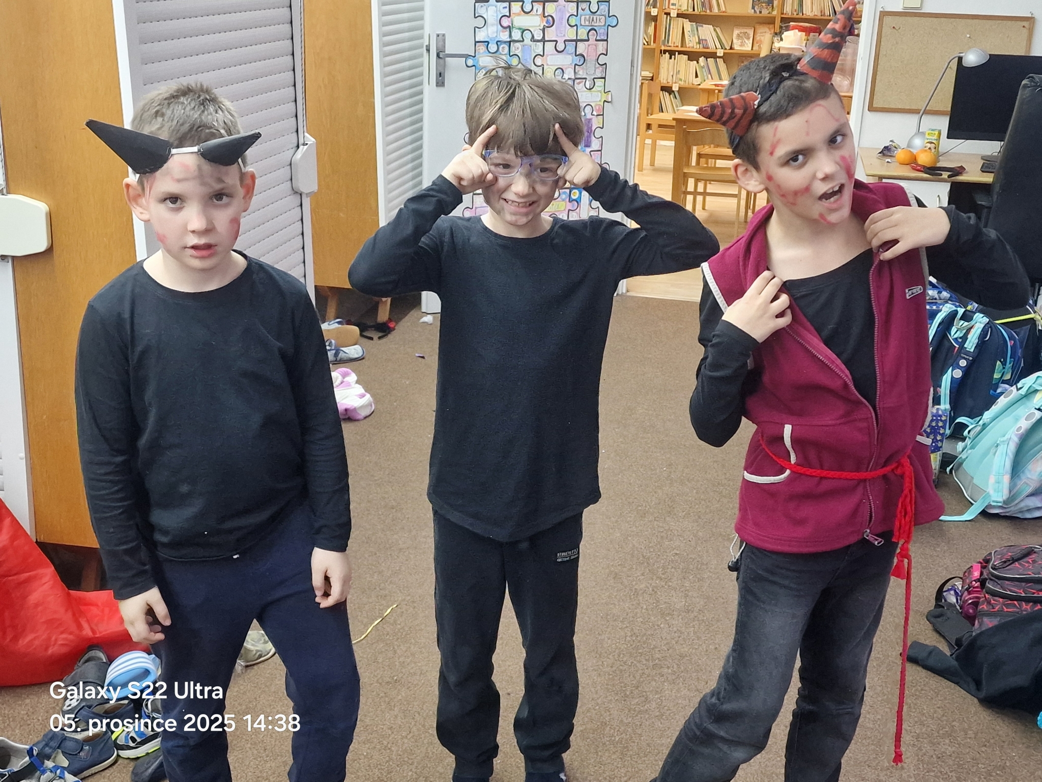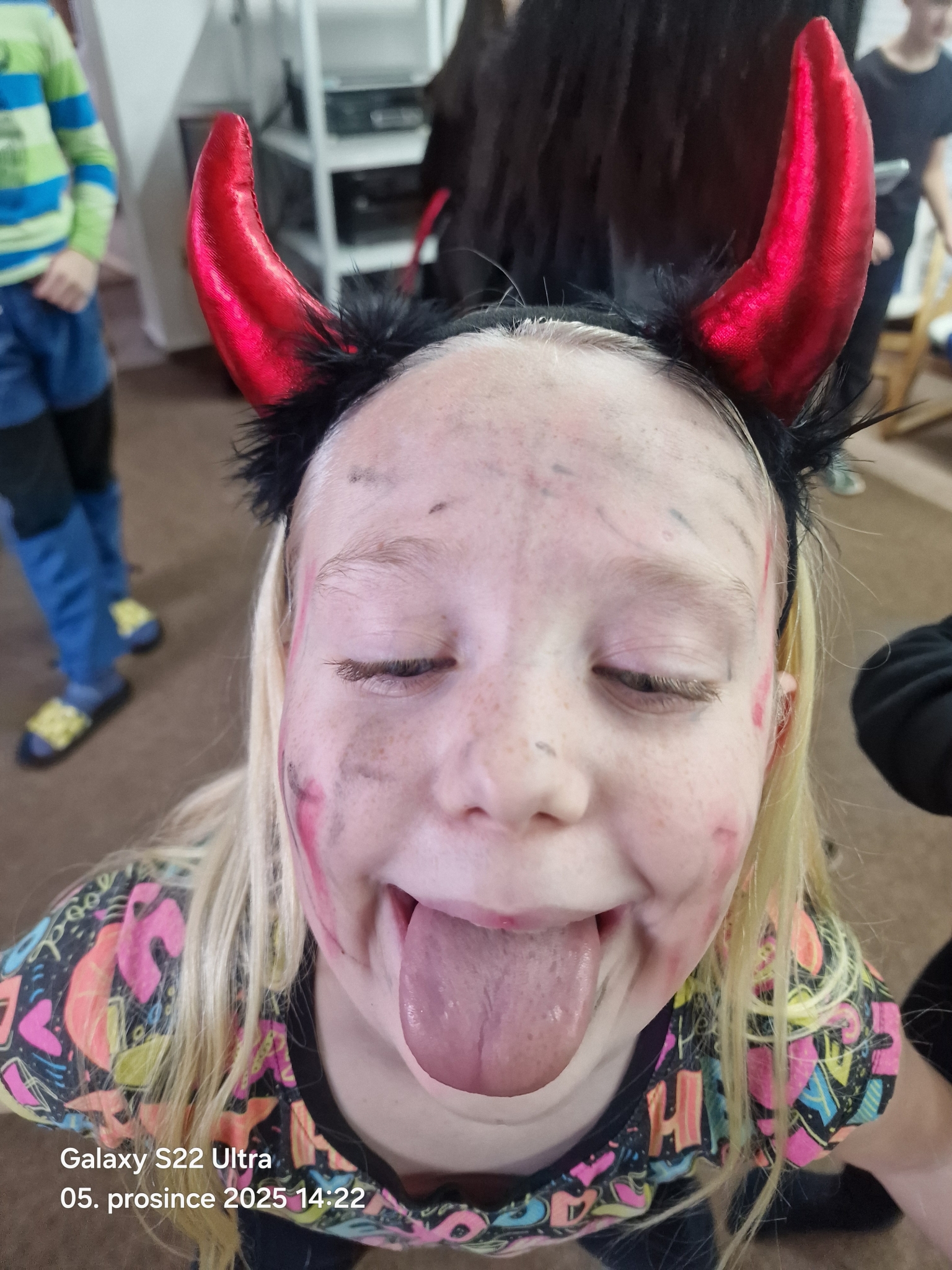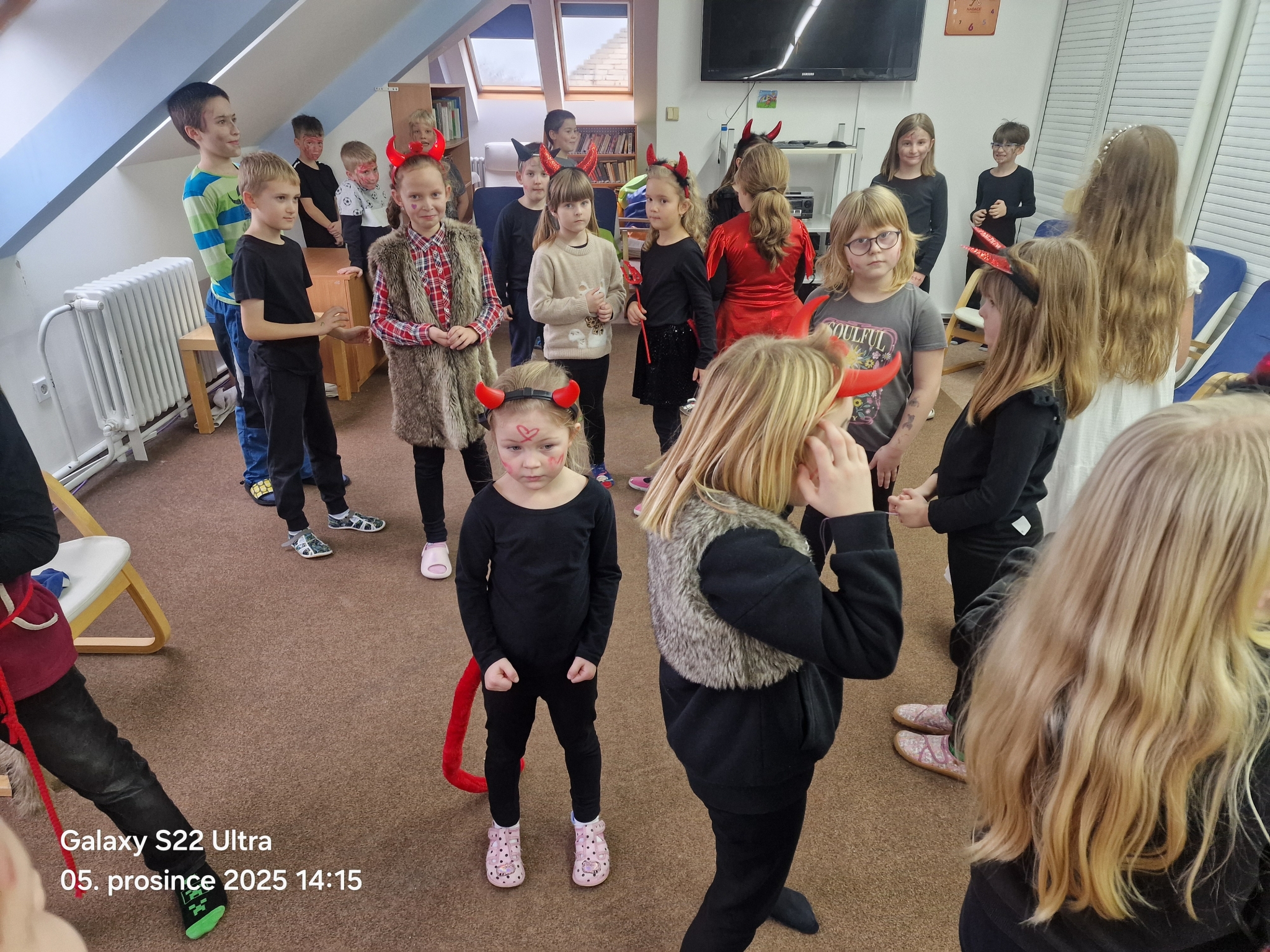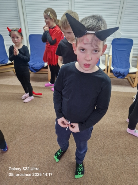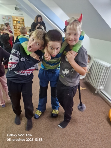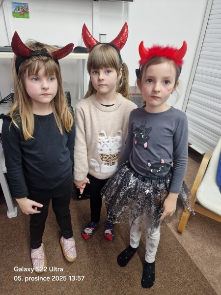 Odpoledne se děti sešly v družině, kde na ně čekal pořádný čertovský rej. Hned na úvod se představili malí čertíci se svými originálními čertovskými jmény, která si pro tuto příležitost připravili. Následovaly soutěže - skákání v pytli, které s "kopýtky" zvládli levou zadní, volba nejkrásnějšího čertího obličeje a mnoho dalších her, při nichž nechyběl pohyb, smích a pořádná porce zábavy.