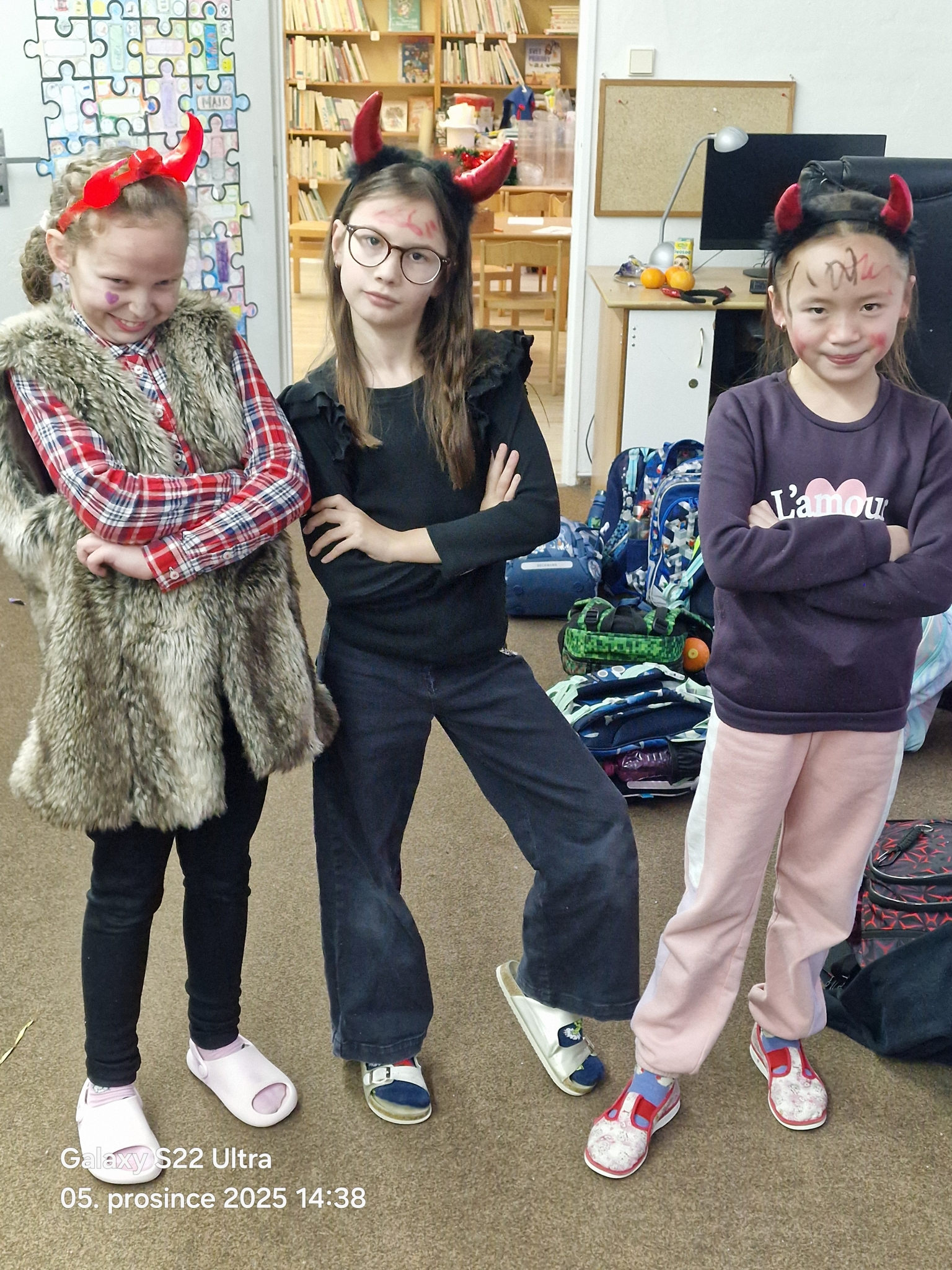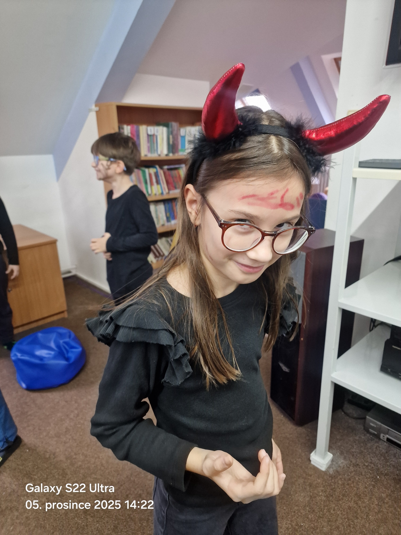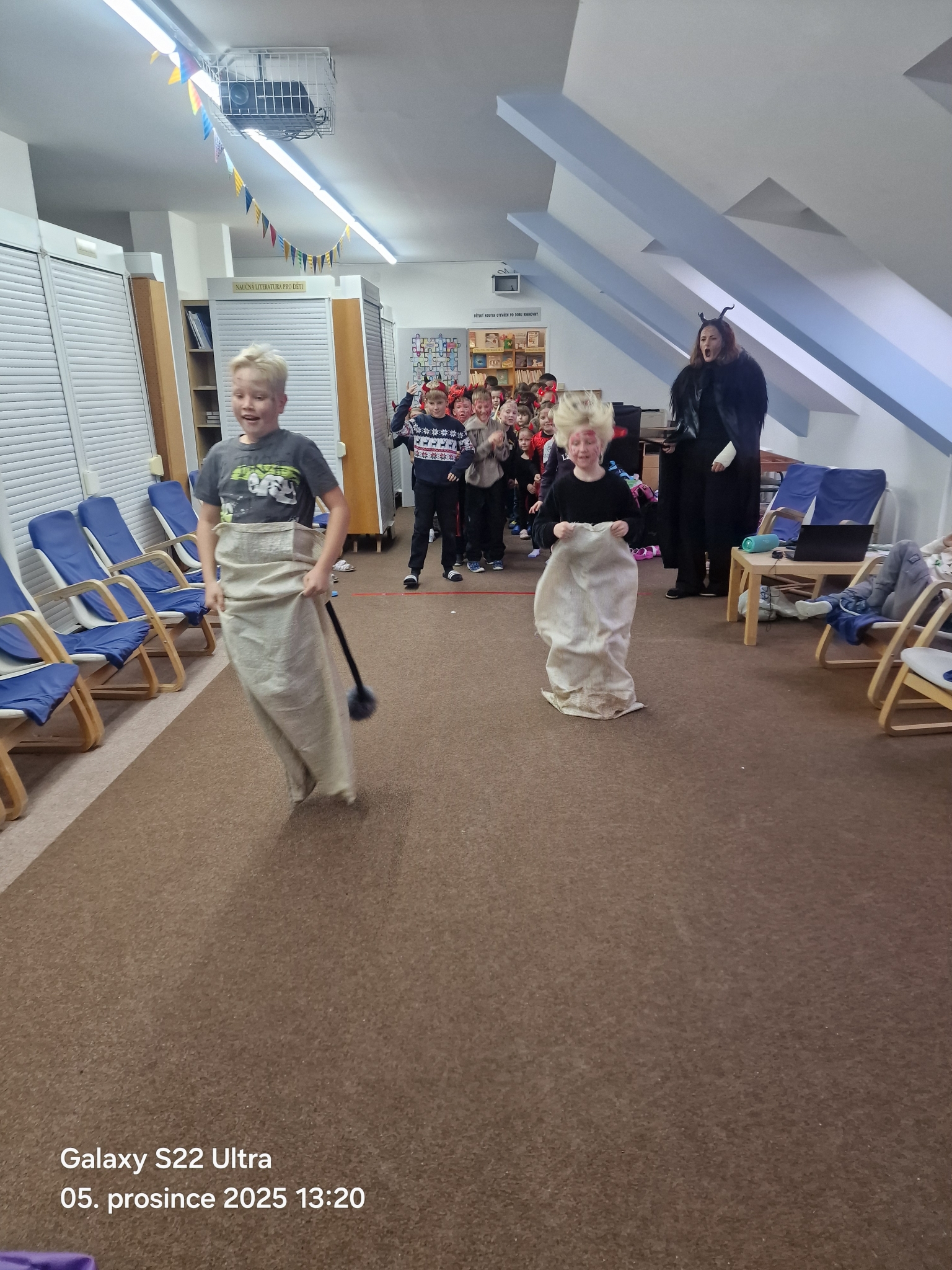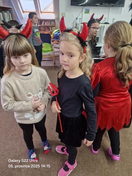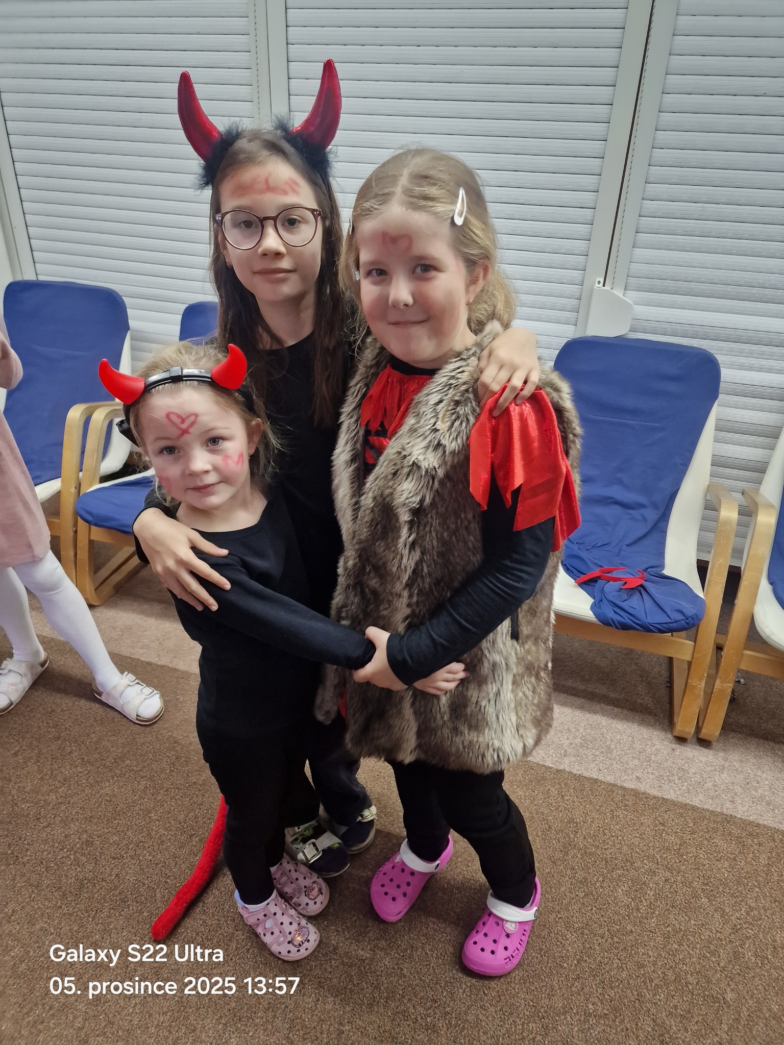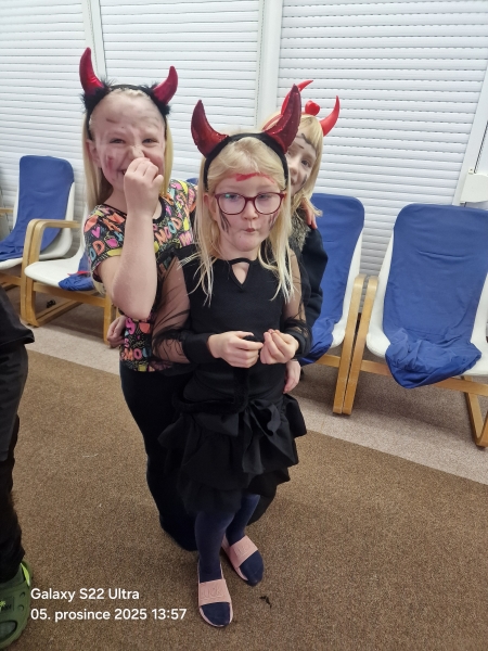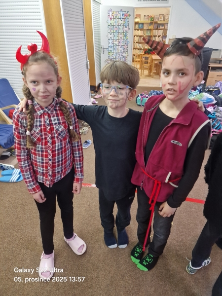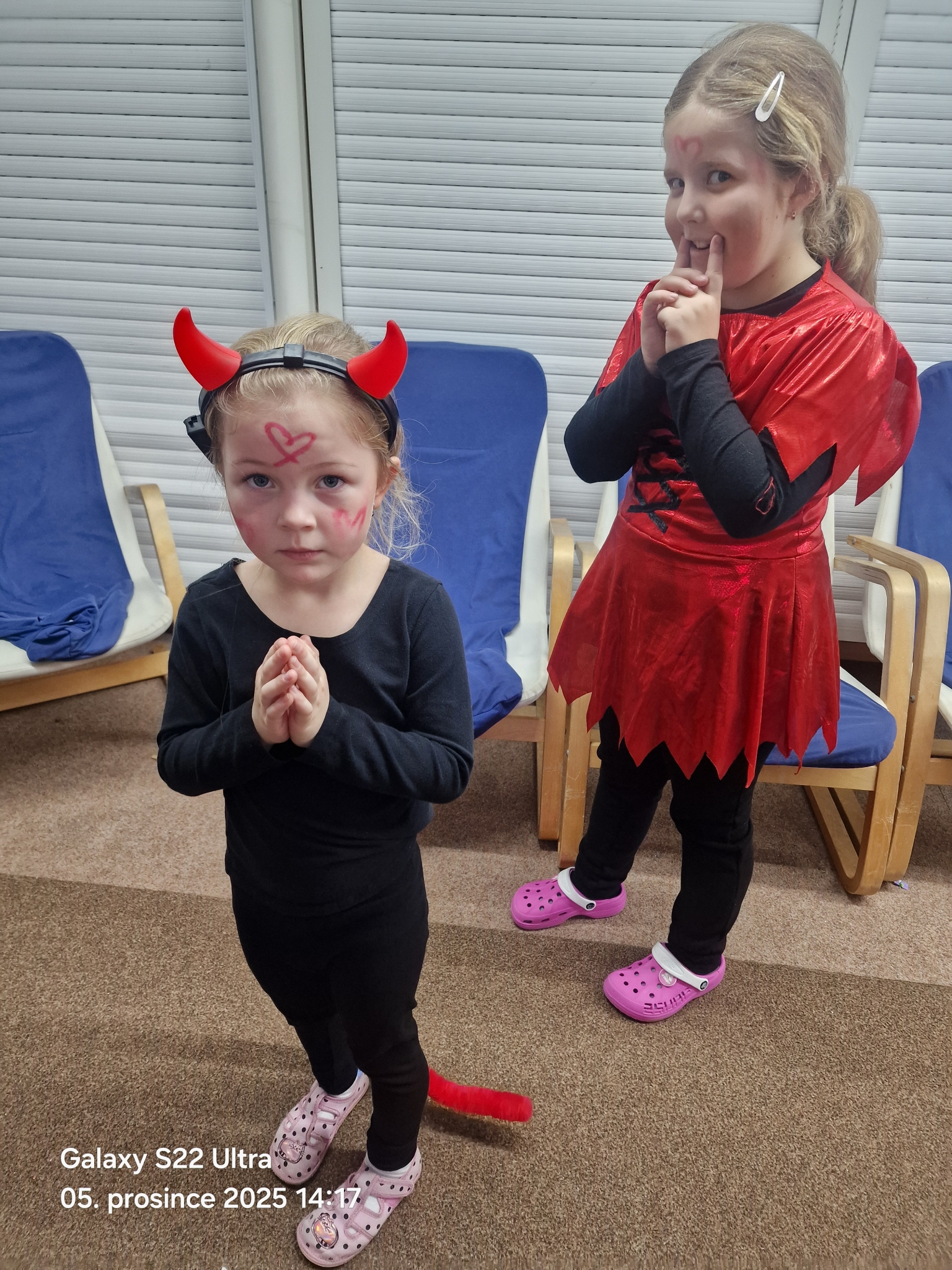 Odpoledne se děti sešly v družině, kde na ně čekal pořádný čertovský rej. Hned na úvod se představili malí čertíci se svými originálními čertovskými jmény, která si pro tuto příležitost připravili. Následovaly soutěže - skákání v pytli, které s "kopýtky" zvládli levou zadní, volba nejkrásnějšího čertího obličeje a mnoho dalších her, při nichž nechyběl pohyb, smích a pořádná porce zábavy.