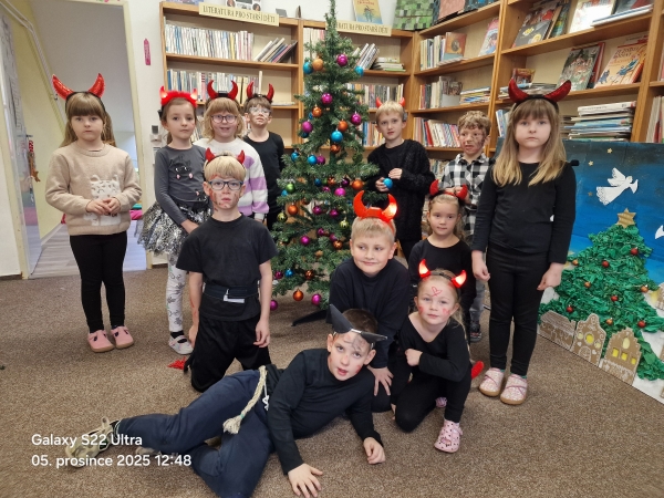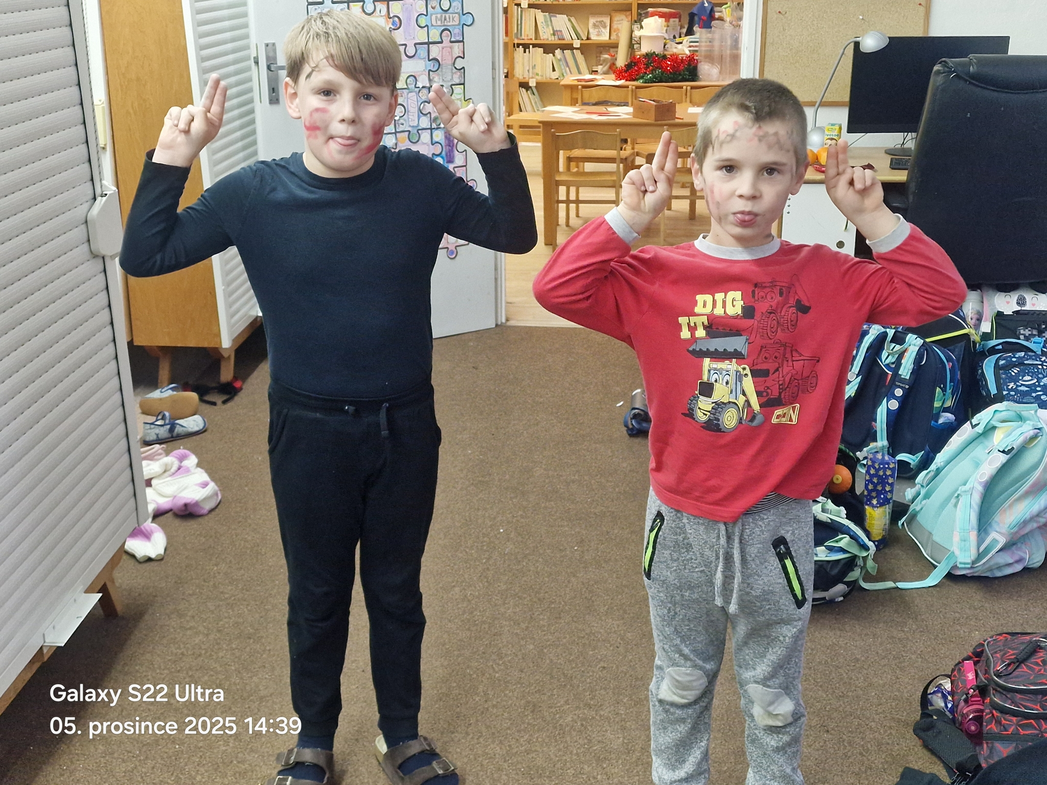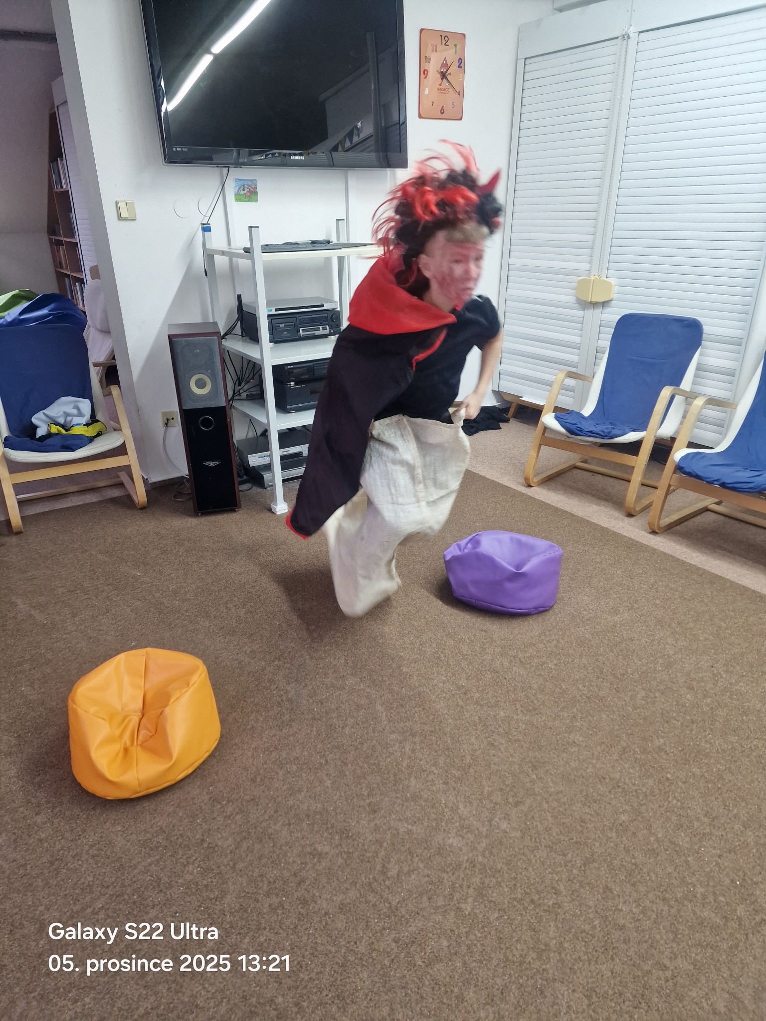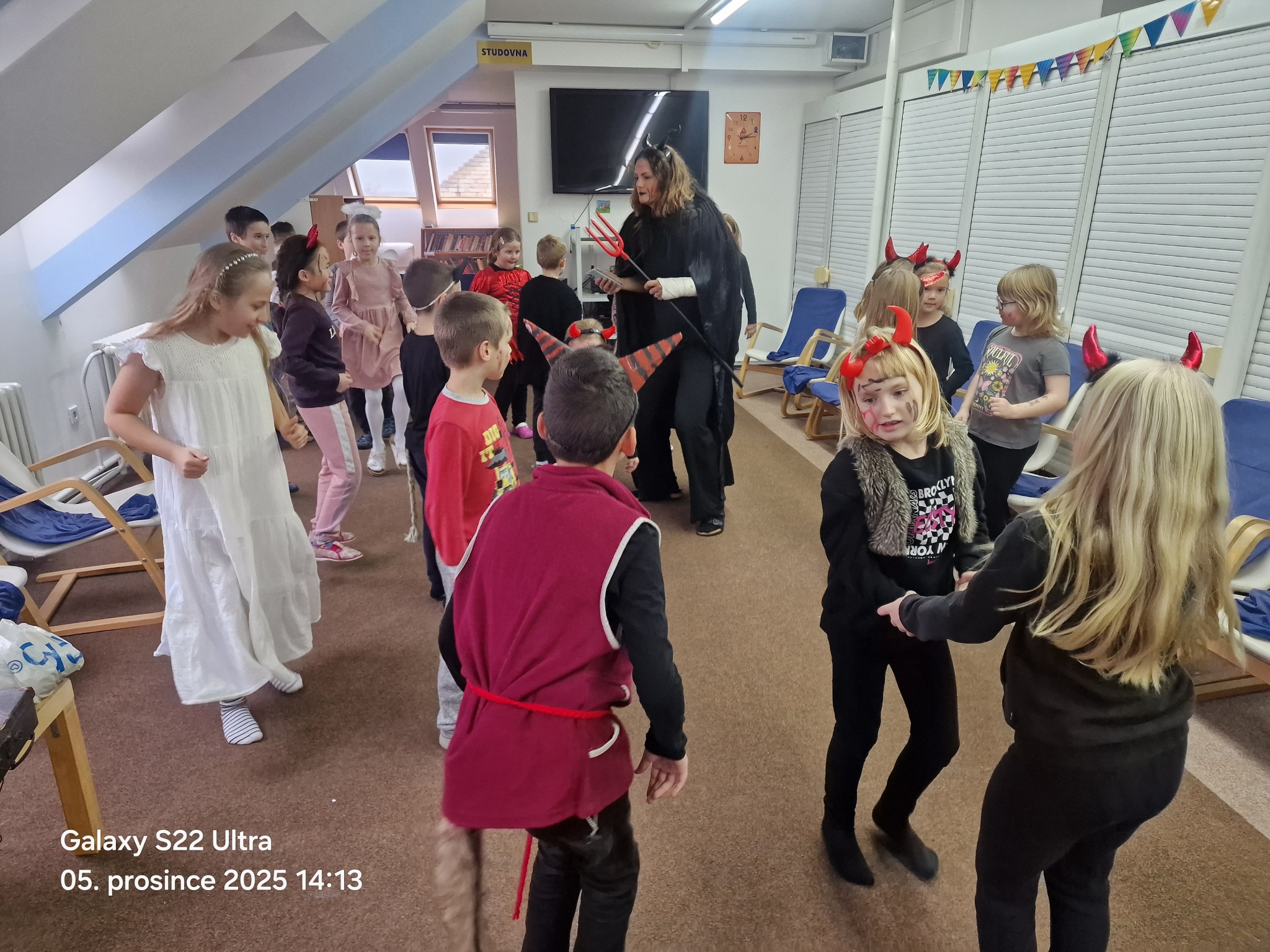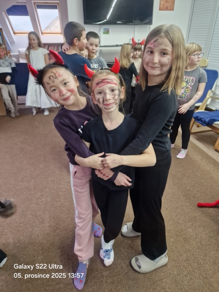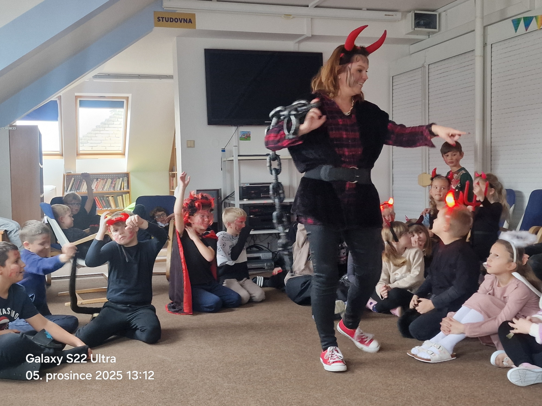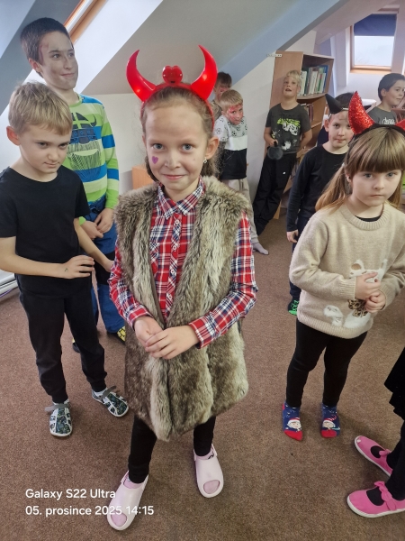 Odpoledne se děti sešly v družině, kde na ně čekal pořádný čertovský rej. Hned na úvod se představili malí čertíci se svými originálními čertovskými jmény, která si pro tuto příležitost připravili. Následovaly soutěže - skákání v pytli, které s "kopýtky" zvládli levou zadní, volba nejkrásnějšího čertího obličeje a mnoho dalších her, při nichž nechyběl pohyb, smích a pořádná porce zábavy.