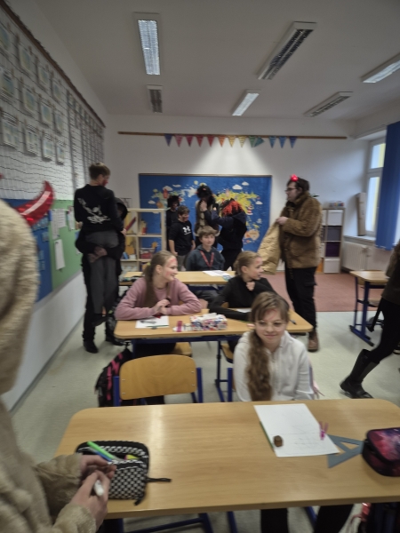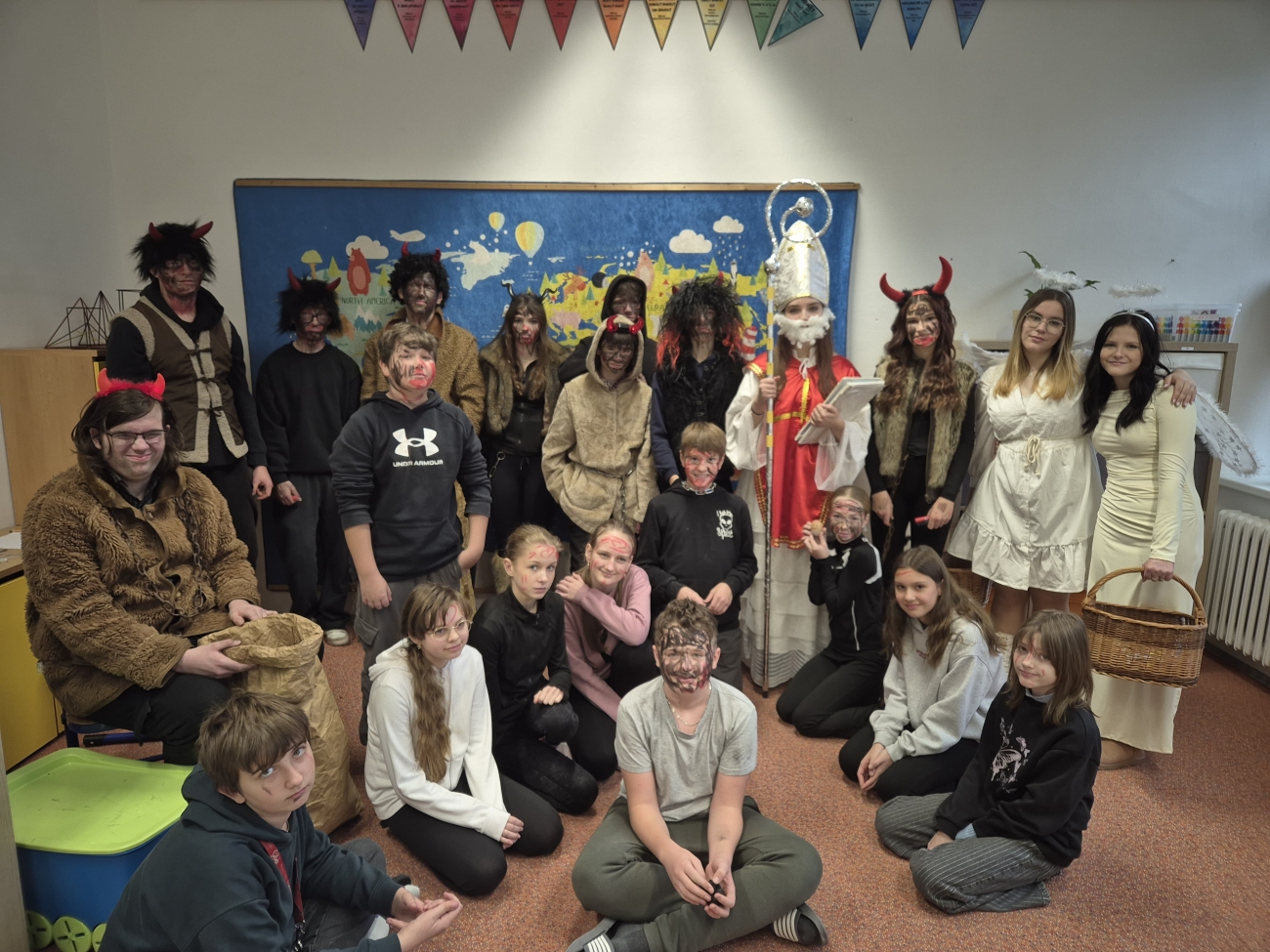 Den 5. prosince se u nás ve škole nesl v opravdu kouzelné atmosféře. Dopoledne k nám do třídy vstoupili Mikuláš, čert a andělé zrovna ve chvíli, kdy jsme psali písemku z matematiky. Přinesli s sebou směs napětí i smíchu a hned se pustili do zjišťování, kdo byl během roku hodný. Někteří z nás měli dokonce namále – čert si jednoho žáka symbolicky odvedl do našeho sklepního pekla, ale naštěstí se všichni nakonec vrátili zpět do lavic.