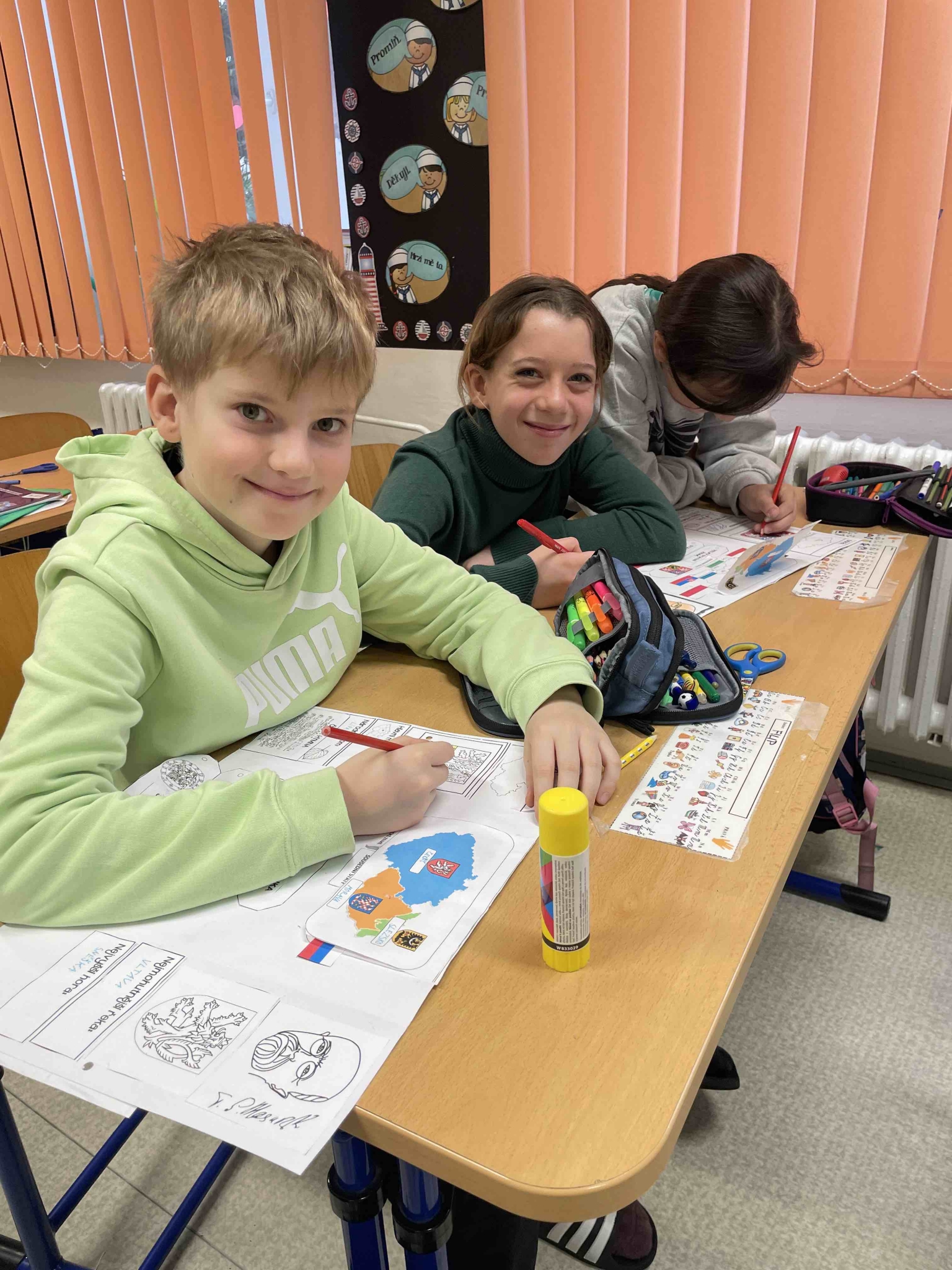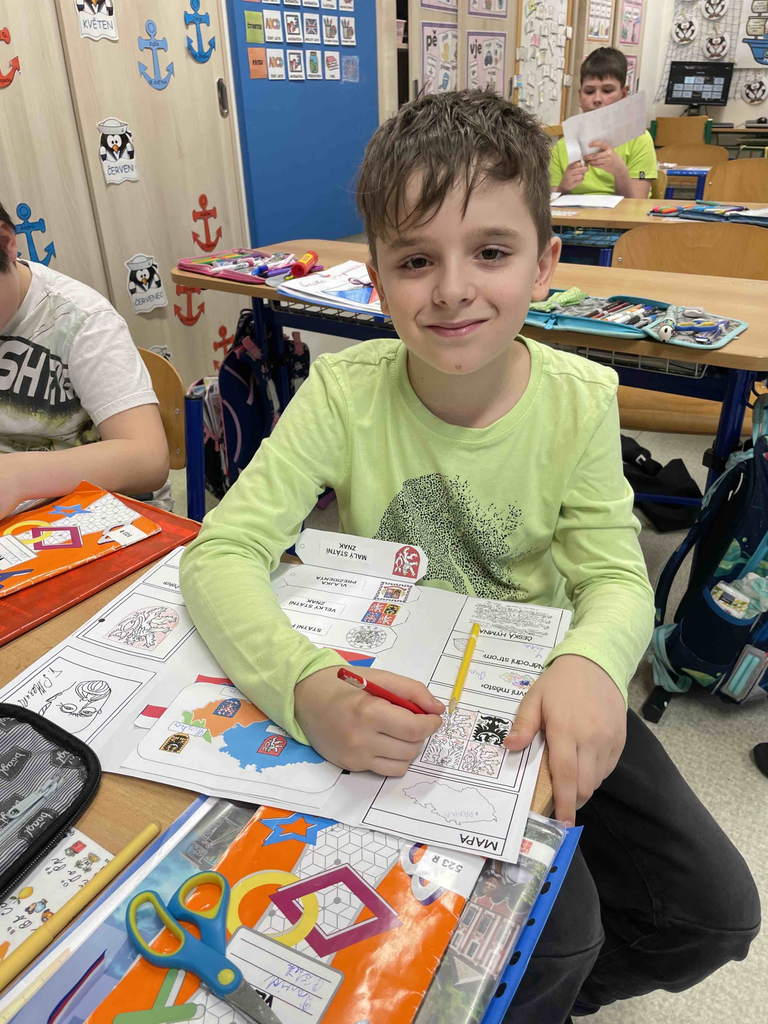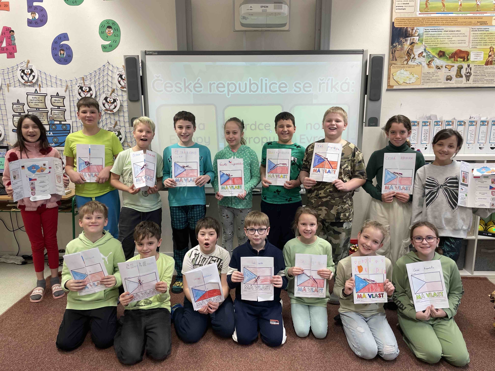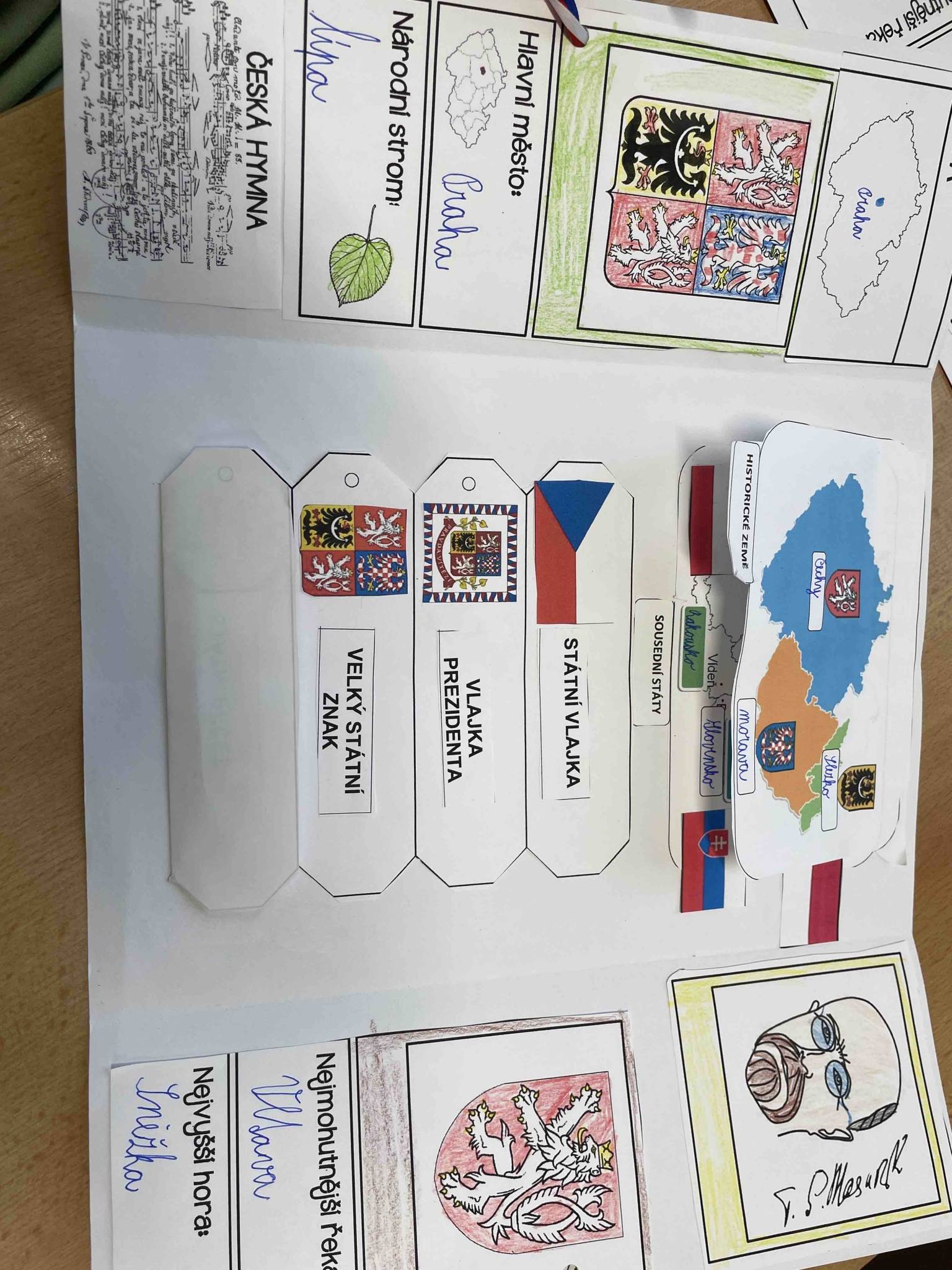 Žáci pracovali ve skupinách i samostatně a postupně zpracovávali základní informace o naší vlasti. Do svých lapbooků zaznamenávali důležité údaje o České republice, jako je hlavní město, státní zřízení či sousední státy. Nechyběla ani kapitola věnovaná státním symbolům – státní vlajce, znaku, hymně, pečeti a prezidentské standartě.