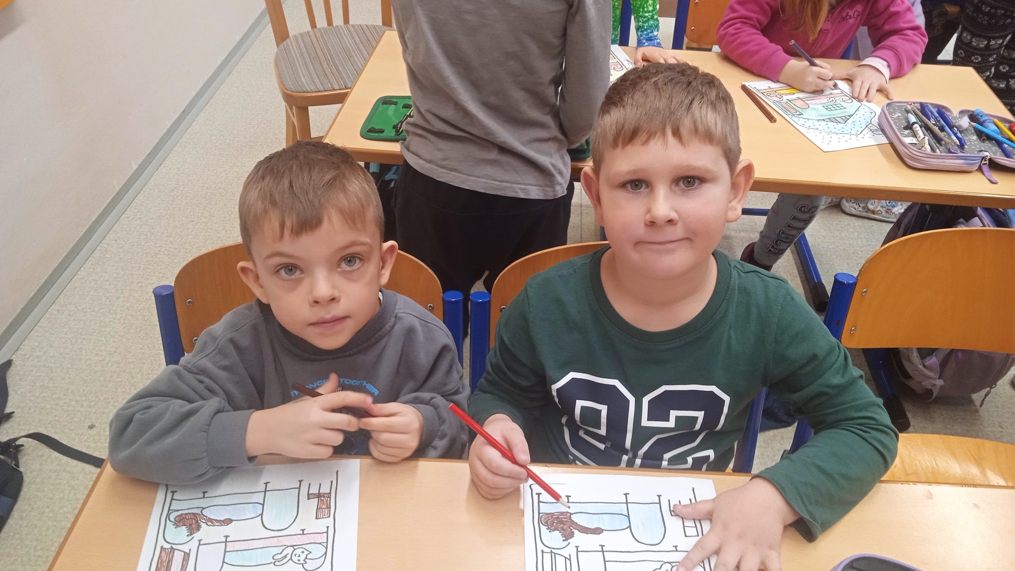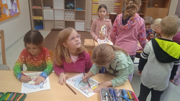 Součástí programu bylo i tvoření – každý malý návštěvník si odnesl drobnou radost. Za svou šikovnost a spolupráci děti dostaly krásný obrázek z pohádky O pejskovi a kočičce, který si společně s druháky vymalovaly. Tvoření přineslo nejen radost z barev a fantazie, ale také možnost spolupráce a sdílení zážitků mezi mladšími a staršími dětmi.