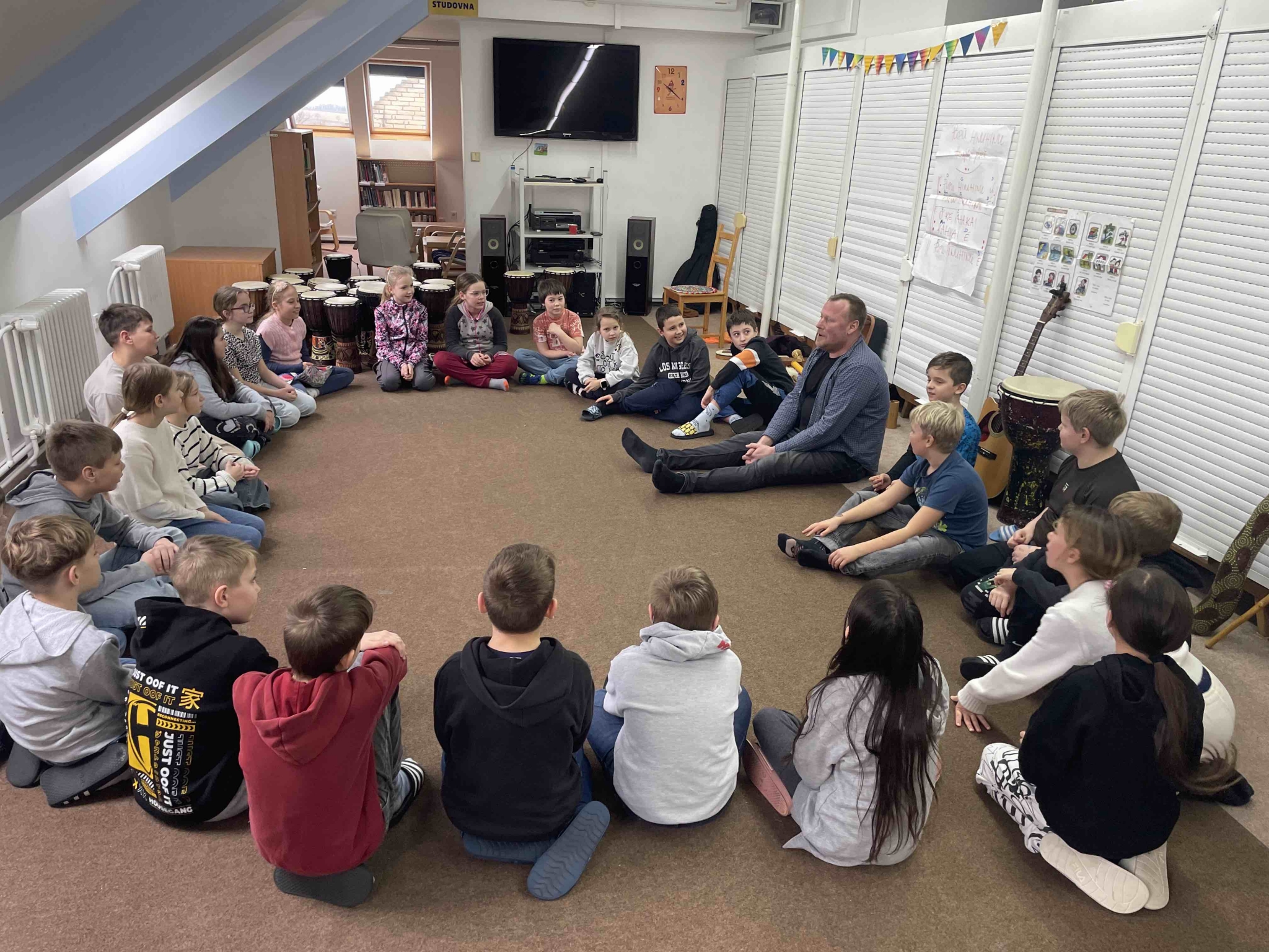 Do naší školy zavítal hudebně dramatický program s názvem S hudbou kolem světa, který nám přijel představit pan Zdeněk Vilímek. A bylo to skutečně putování napříč kontinenty! Děti se během programu vydaly na hudební cestu kolem světa a poznávaly různé kultury prostřednictvím rytmu, pohybu a zpěvu. Vyzkoušely si hru na africké bubny a objevily kouzlo australského nástroje didgeridoo. Nechyběly ani pohybové a rytmické hry, při kterých bylo potřeba zapojit nejen tělo, ale i spolupráci a pozornost. Společně jsme si zazpívali havajskou ukolébavku, naučili se indiánskou píseň a na chvíli se přenesli do dalekých krajin. Program přirozeně propojoval smyslové vnímání, psychomotoriku i tvořivost.