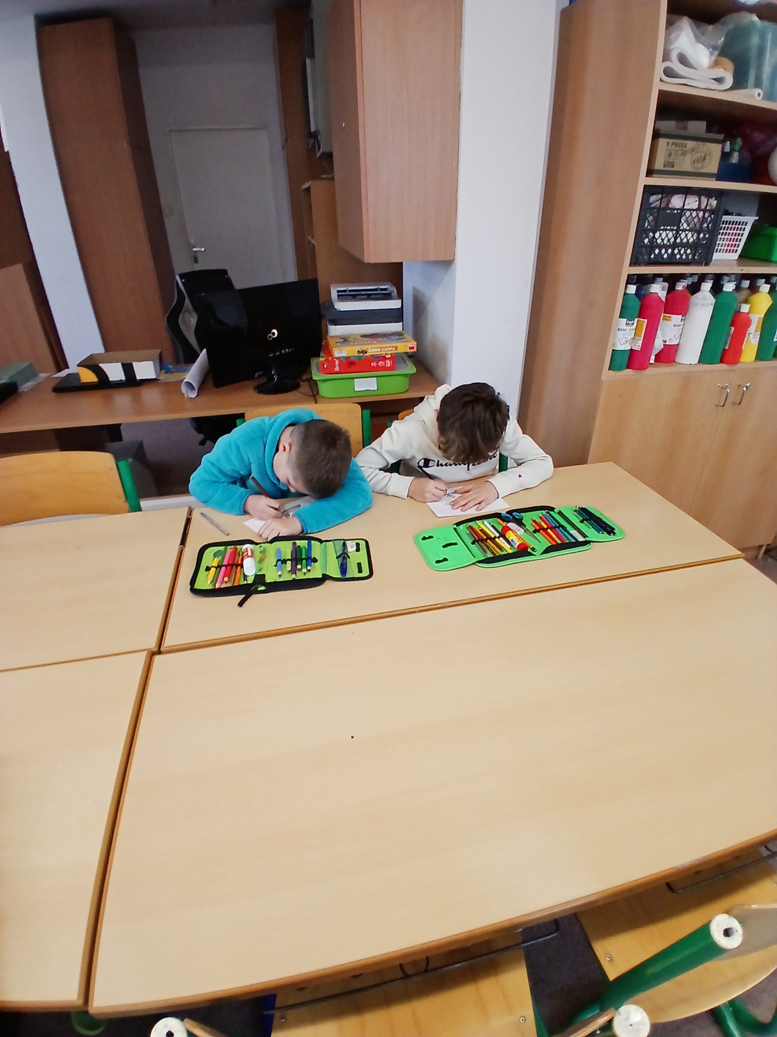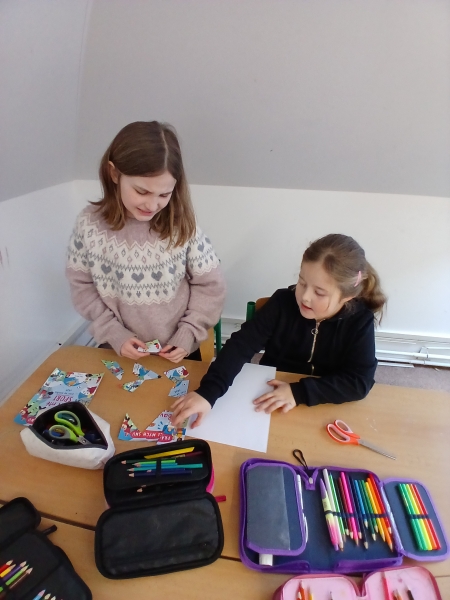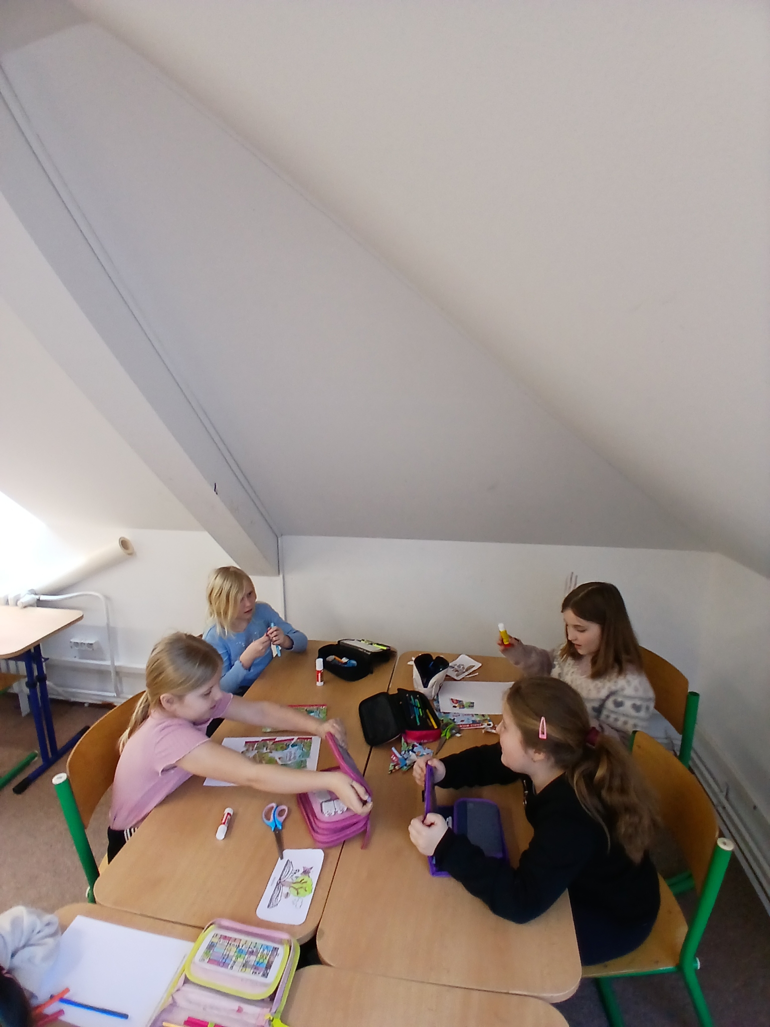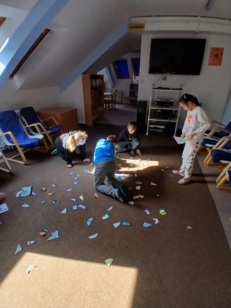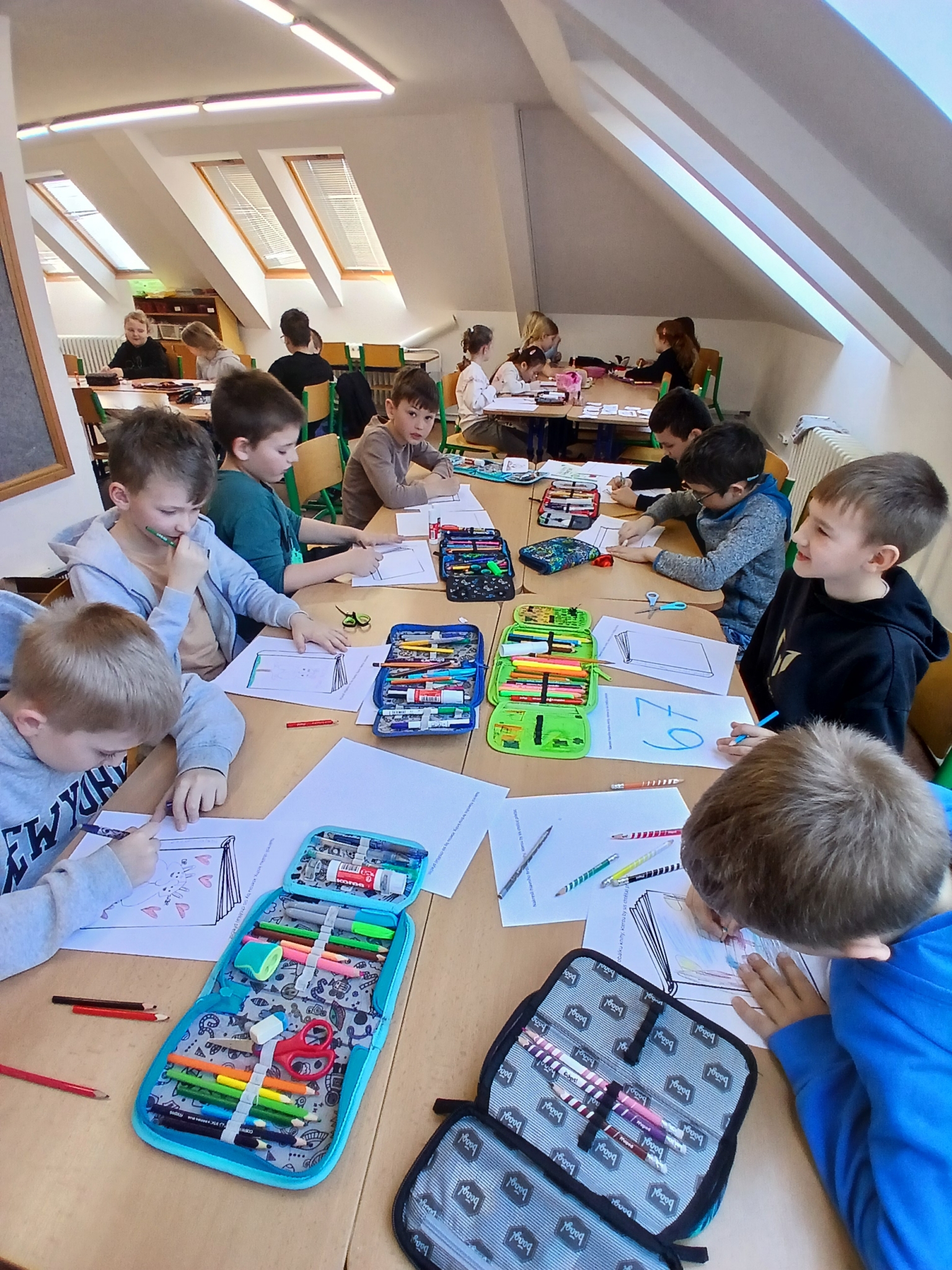 V ateliéru si děti vyzkoušely práci ilustrátorů – skládaly obálky knih, navrhovaly svou vlastní titulní stranu a vymýšlely vlastního knižního hrdinu. Společně vznikl i krásný kooperativní obrázek. ????✨