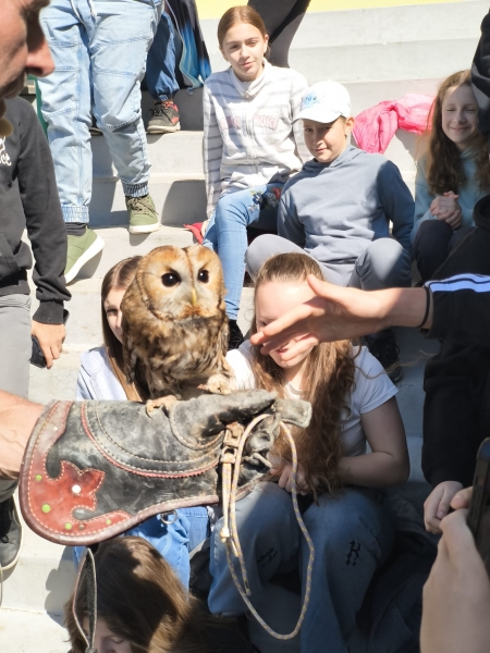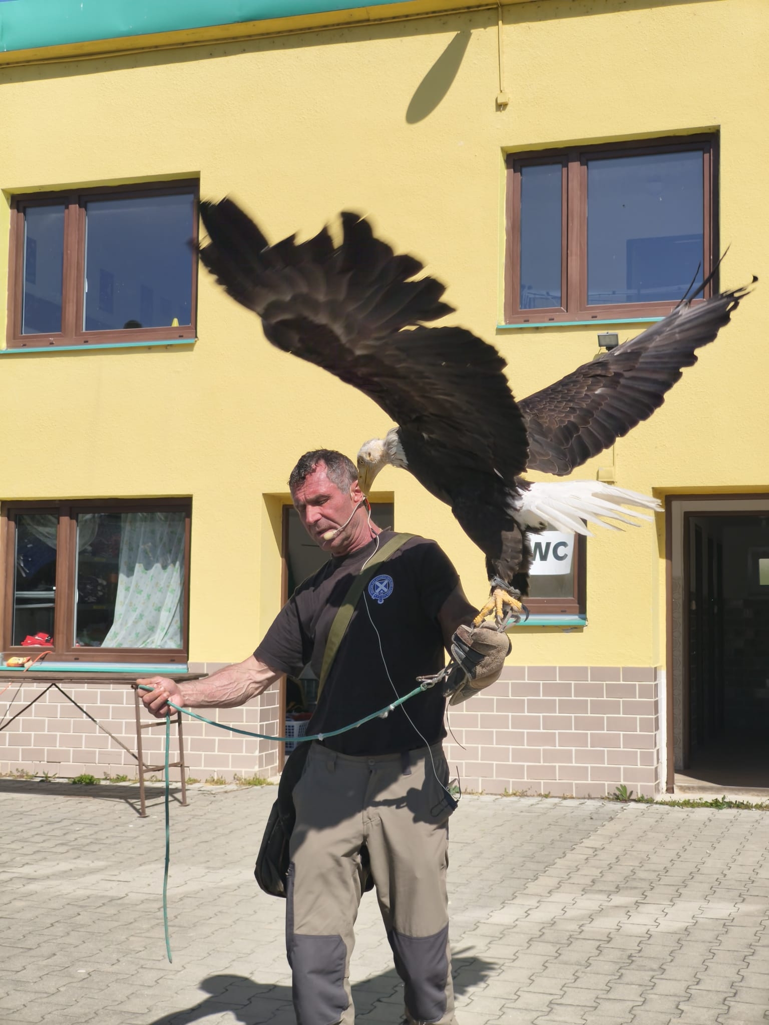 Celá akce proběhla na fotbalovém hřišti, kde se sešla celá škola – a bylo se opravdu na co dívat! Vancos nám představil řadu dravých ptáků – od sov a jestřábů až po majestátní orly – a poutavě přiblížil jejich život, způsob lovu i výcvik.