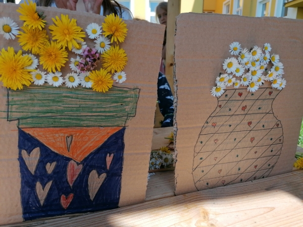 Kdy jindy jít s dětmi ven, než když se všechno zelená, pučí a kvete? K výrobě vázy stačí jen kus kartonu a obyčejná tužka. Na karton si předkreslí motiv vázy, nůžkami udělají dírky a do vzniklých dírek pak hledají ty nejhezčí květy a podle své fantazie tvoří vlastní umělecké dílo :-) I chodník u školy zdobí krásné květiny, zvířátka a včelky, které děti namalovaly ve výtvarné výchově :-)