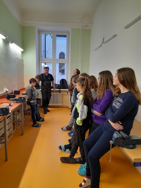 V úterý proběhlo další setkání s mistrem z SOŠG Staré Město panem Pírkem z kovodílny. Žáci si vyzkoušeli pájení, pevný a rozebíratelný spoj a v druhé části vyráběli šroub a matici. Ve školní dílně se vystřídali žáci 6. a 8. ročníku. Žáci získali další cenné zkušenosti pro budoucí výběr povolání. Mnohé z nich práce velmi bavila, a tak to na výrobcích bylo vidět. Těšíme se na další podnětné návštěvy.