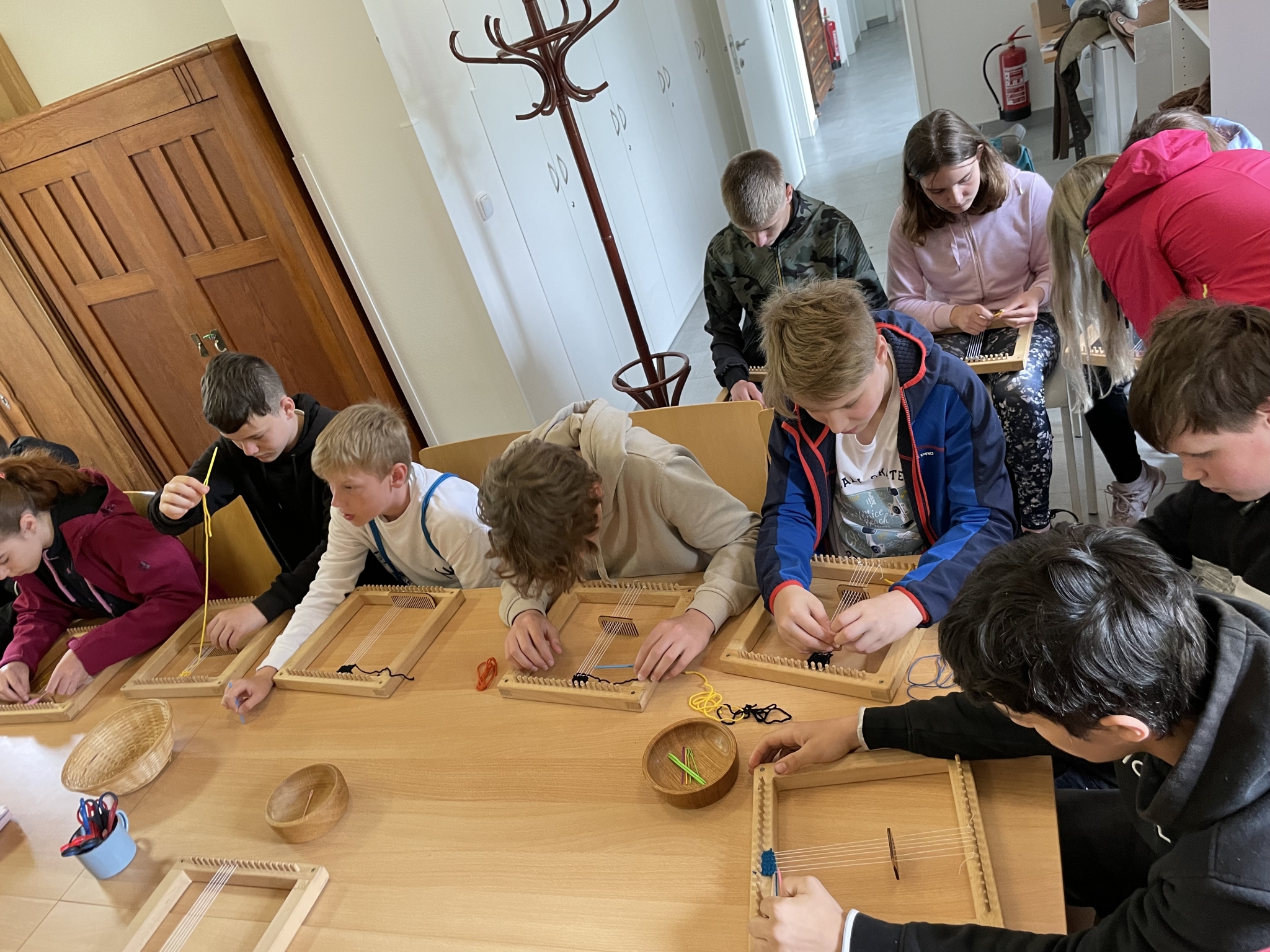 Ve středu se žáci 6. a 7. ročníku zúčastnili v parku Rochus výukového programu Šaty rostou na louce. Společně s paní průvodkyní si osvojili cestu tvorby lněného vlákna a některé kroky výroby si dokonce vyzkoušeli. Příjemným překvapením pro nás bylo, že postup přípravy lněného plátna všichni žáci znají již od malička, neboť jako malí poslouchali pohádku Krtek a kalhotky. Zároveň během programu prohlubovali své znalosti o tom, jak lidé žili dříve. Odměnou na konci programu bylo tvoření vlastního náramku nebo záložky na modelu tkalcovského stavu.