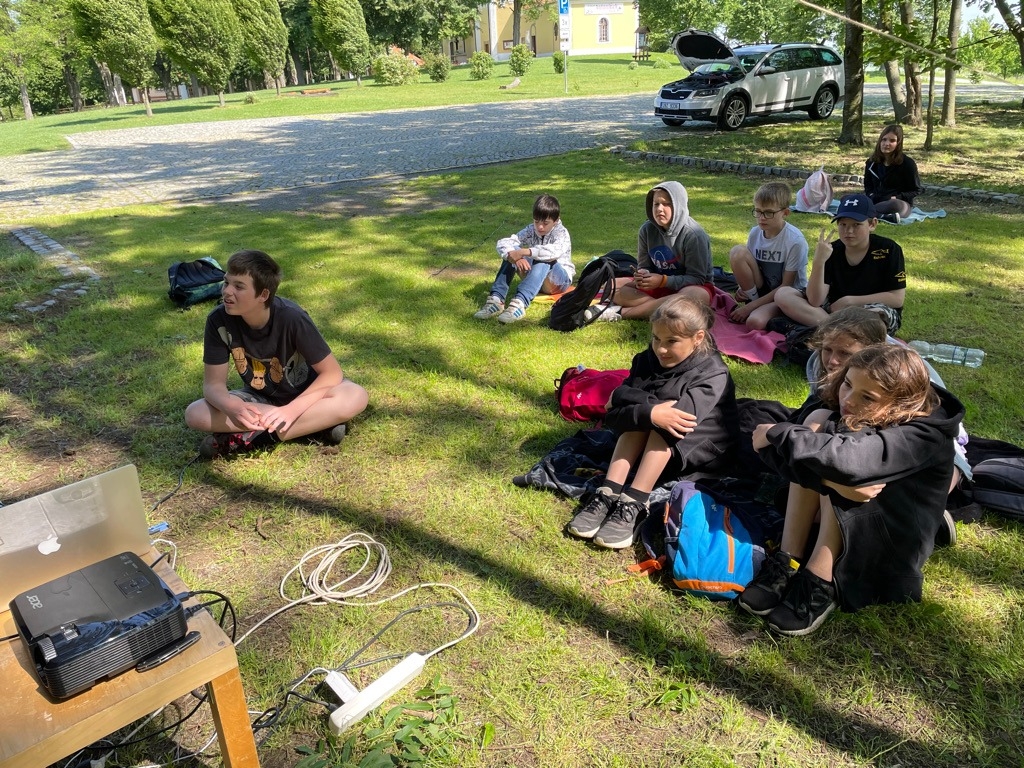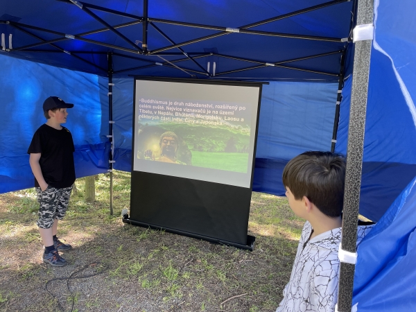 Dnešní celodenní projektový den žáků 6.třídy se nesl v duchu Světových náboženství. Ráno jsme vyrazili na sv. Antonínek, kde nás čekalo spoustu zajímavých aktivit. První překážku nám přineslo větrné počasí. Nenechali jsme se však odradit a společnými silami se nám podařilo nejen postavit a ukotvit stan, ale také pokořit přírodní živly. Pak se již žáci věnovali prezentaci jednotlivých náboženských směrů, na kterých usilovně pracovali v hodinách občanské výchovy a zeměpisu. A nutno dodat, že si na prezentacích dali záležet. Po náročné práci následovala chvilka relaxace, kterou jsme vyplnili piknikem. Ten byl zaměřen na ochutnávku typických židovských pokrmů jako: babaganoush, humus, shakshuka a halva jako sladká tečka. Jakmile jsme uspokojili chuťové buňky, následovala další práce v podobě běhacího kvízu, zaměřeného jak jinak něž na náboženství. Žáci se rozdělili do dvojic a vyrazili do stromové aleje hledat důležité informace, které zaznamenávali do pracovních listů. Úkol byl náročný, ale všem se podařil splnit a zároveň se dozvědět spoustu zajímavých a nových informací. Všichni jsme se shodli, že tento model netradiční a inovativní výuky se nám líbil a už se těšíme na další výzvy.