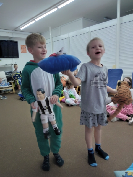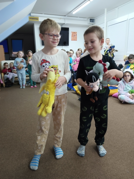 Hurá do pyžam :-) a párty v družině může začít :-) pohodička na polštářcích při relaxační hudbě, módní přehlídka, představení a hod plyšovým mazlíčkem :-) a diskotéka v pyžamu s křupkovým barem :-) Prostě odpoledne plné zábavy a smíchu :-)....jen na to spaní nebyl vůbec čas... :-)