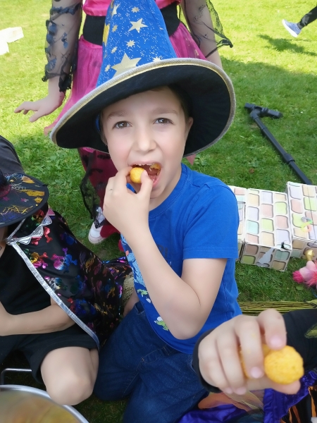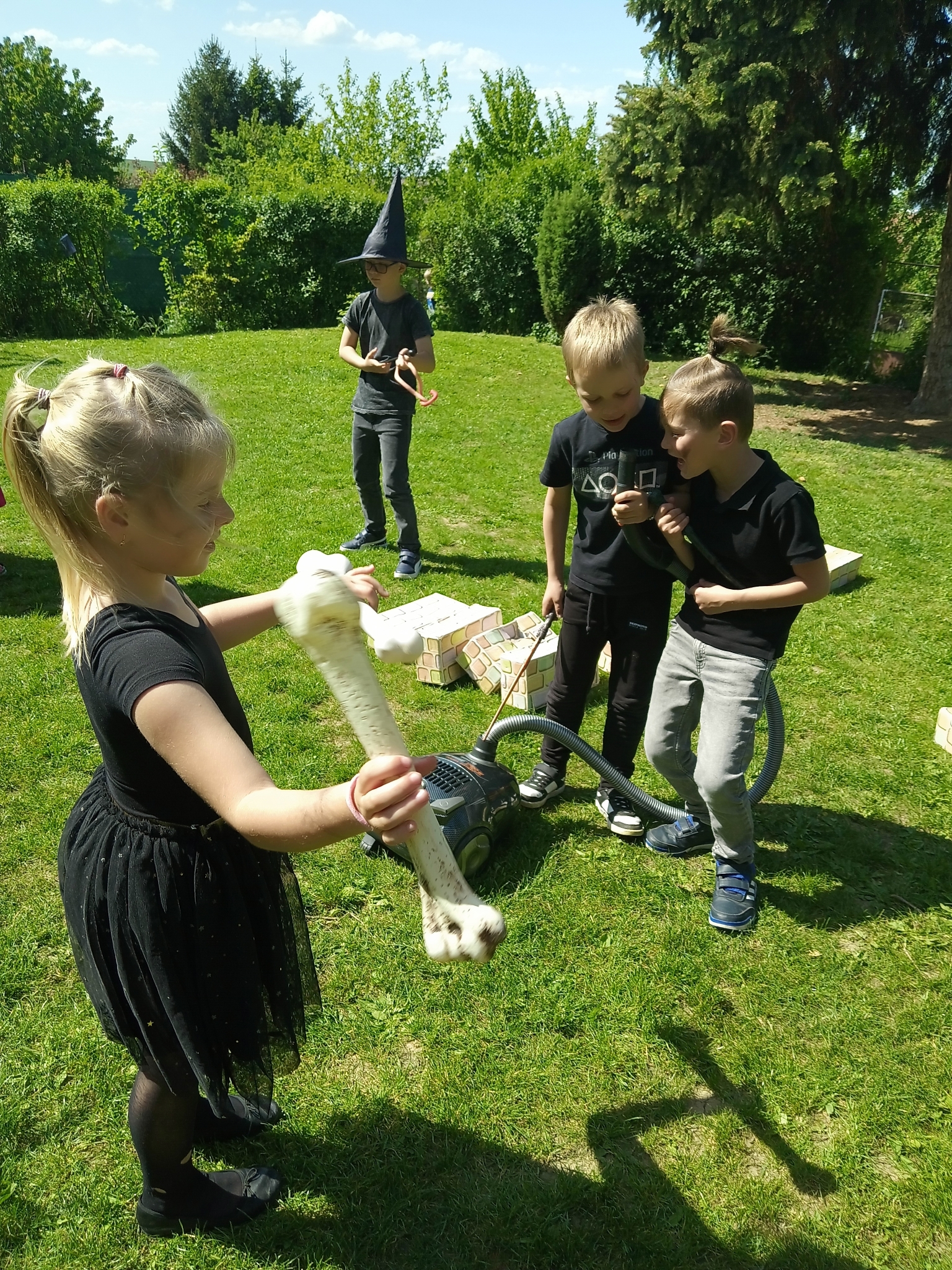 V úterý 30. dubna se účastníci čarodějné školy shromáždili na školní zahradě. Všichni řádně oděni se svými mazlíčky a na dopravním prostředku mohli začít plnit čarodějnou tajenku :-) Následovala rychlostní přehlídka dopravních prostředků a divoký tanec s košťaty :-) Během celého odpoledne se k jídlu podávaly hadí oči, měkké myši, křupaví červi a popíjel se zelený žabí nápoj :-)