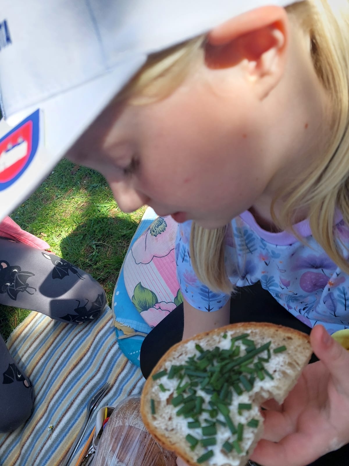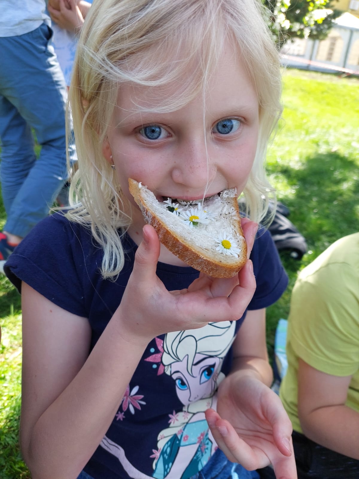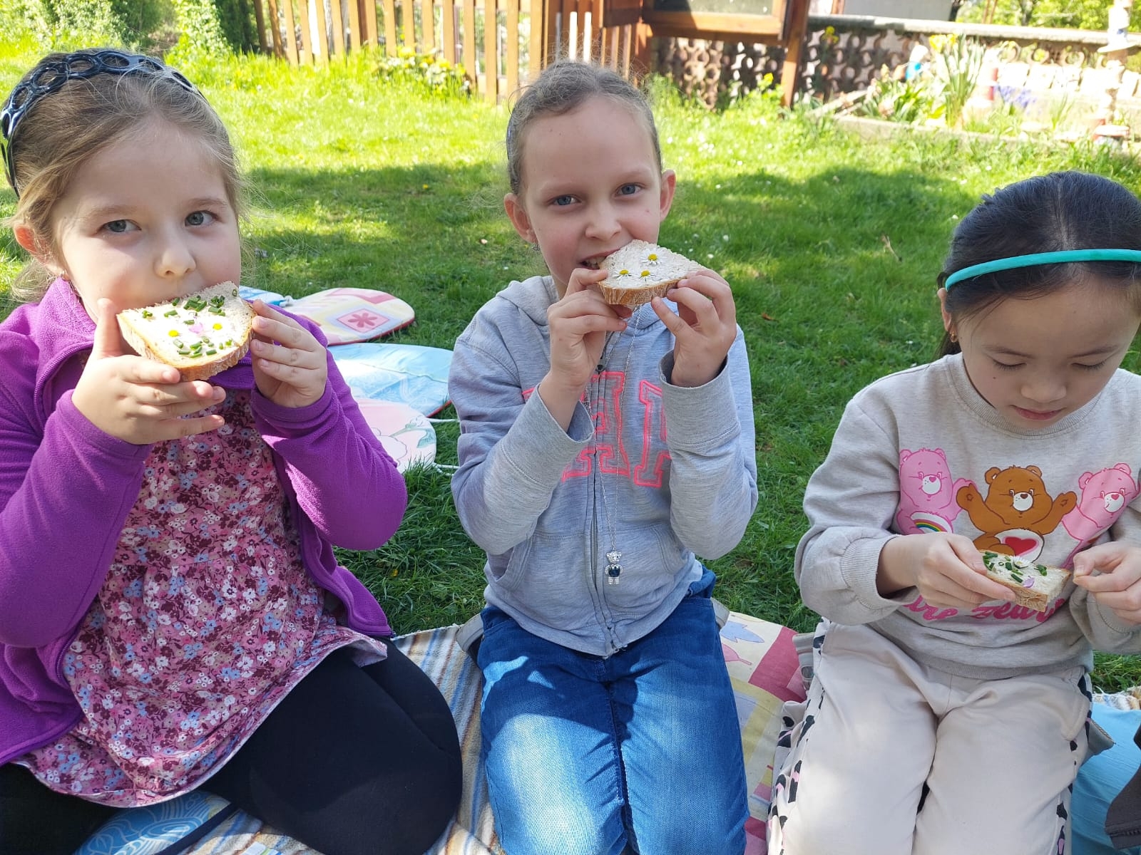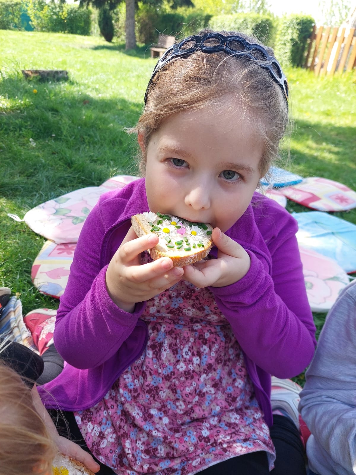 Slunečné počasí přímo vybízí k pikniku na školní zahradě :-) Stačí vzít deky, rozložit ubrus, namazat chleba máslem, natrhat voňavé bylinky, sedmikrásky, pampelišky, kopřivy :-) a hurá na zdravou svačinkovou hostinu pod širým nebem :-)