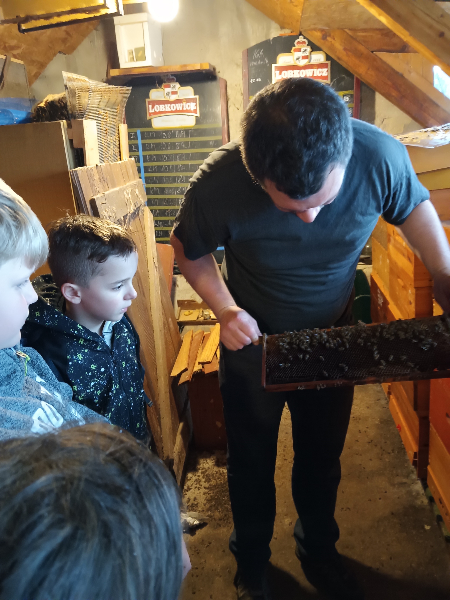 Po vyučování jsme s dětmi ze školní družiny navštívili pana Hájka přímo u jeho včelína. Nahlédli jsme do skutečného úlu, pozorovali včely při práci a viděli i medomet - zařízení, ve kterém se med odstřeďuje ze včelích plástů.