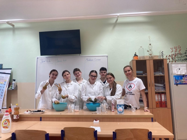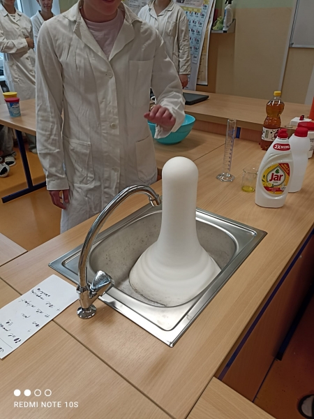 Děti jsou ve své přirozenosti zvídavé, a tak jim neunikne, že se v naší chemicko-fyzikální učebně dějí zajímavé věci. O přestávce nakukují, vyptávají se, jakýpak pokus se tam zase chystá. A protože naši deváťáci toho už hodně umí, v rámci vrstevnického učení našim žákům 3. – 5. třídy nějaké experimenty předvedli a vysvětlili. Prvním úkolem bylo vyrobit zubní pastu pro slona, následovalo oživení Faraonových hadů, kteří voněli jako karamelové cukroví a také prudká exotermická reakce peroxidu vodíku s manganistanem draselným, při které z baňky vyletí vodní pára jako z Aladinovy lampy džin.