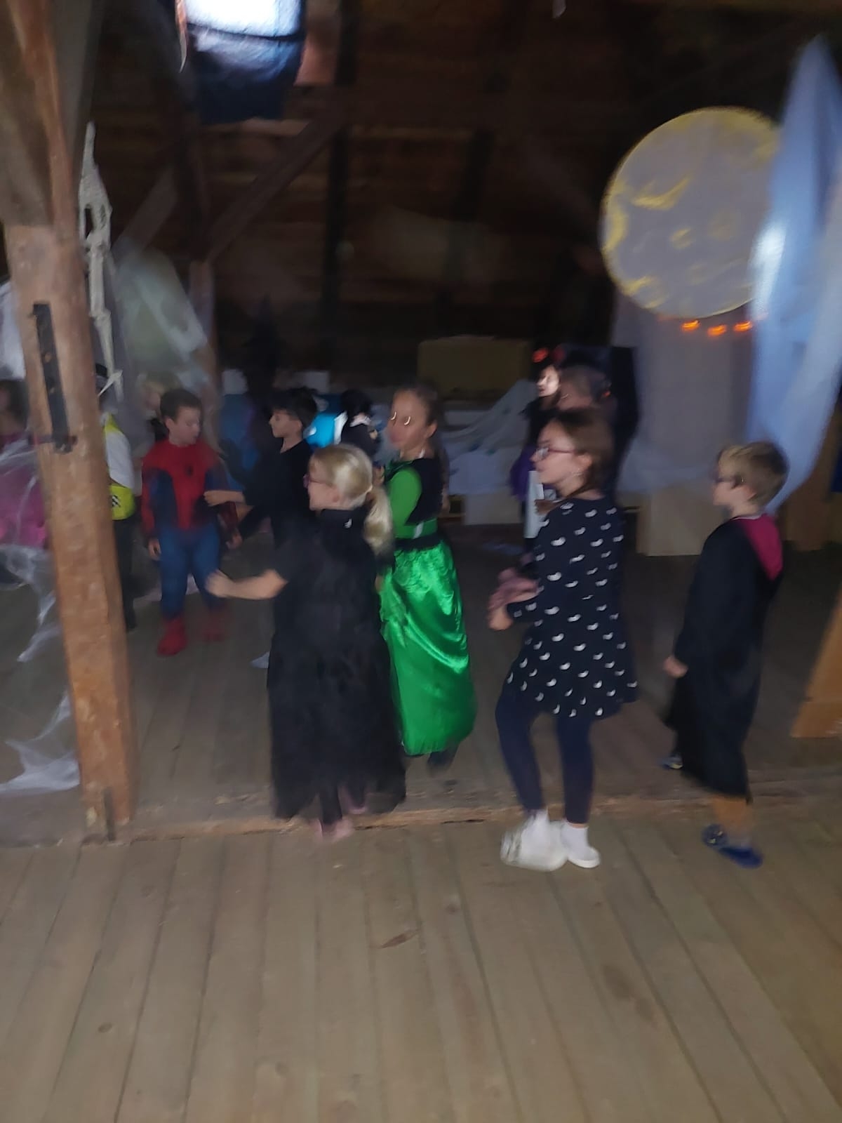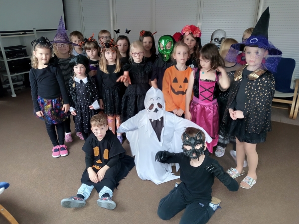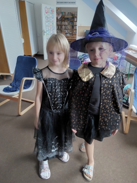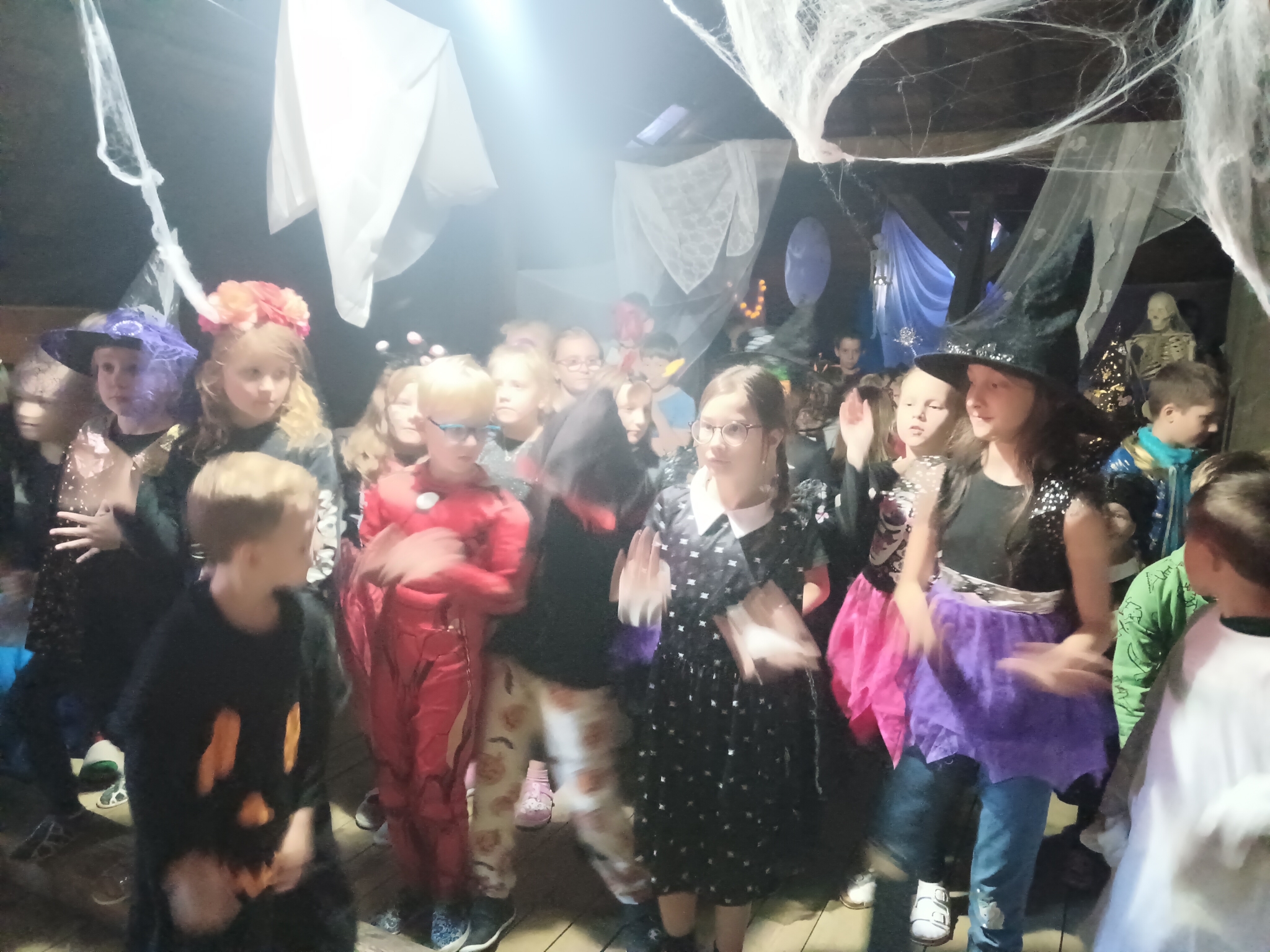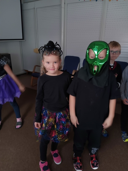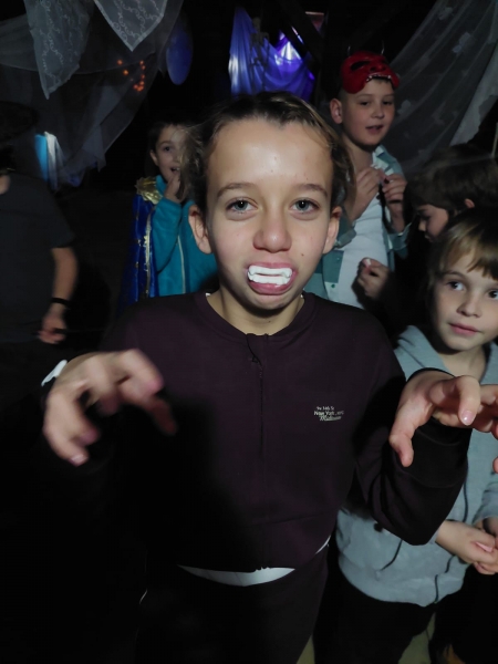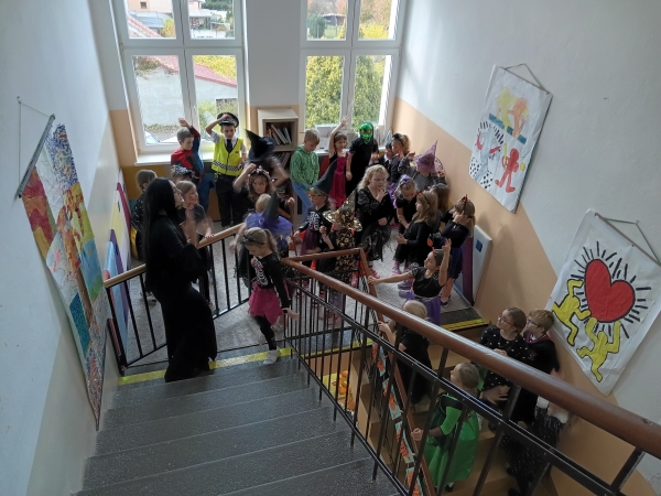 Letos nechyběla stezka s úkoly, pokusy s kostlivcem ani hra na mumie. O skvělou atmosféru se postarala halloweenská diskotéka, na kterou přišli i učitelé v kostýmech a společně s dětmi si zatančili halloweenský tanec :-)