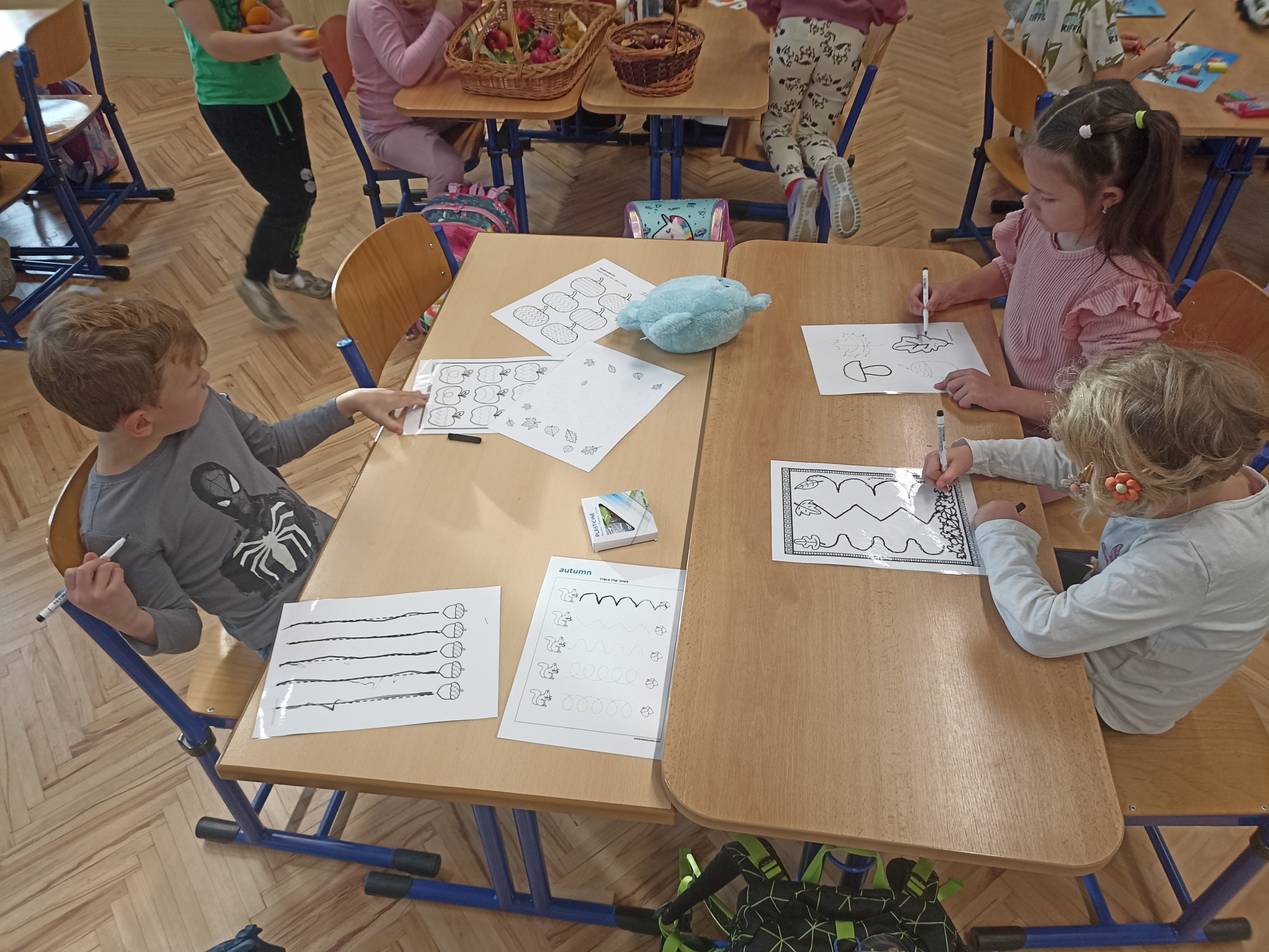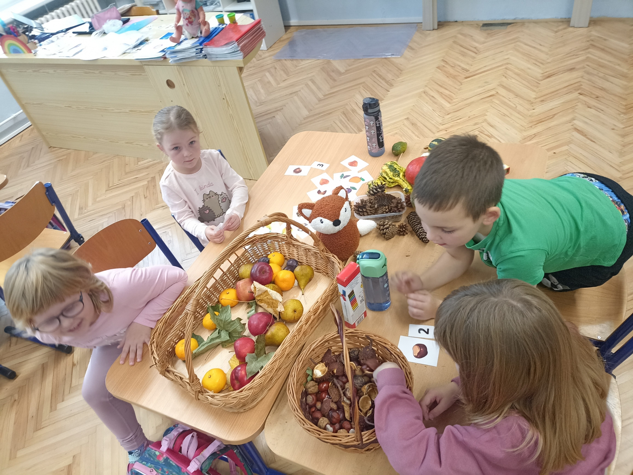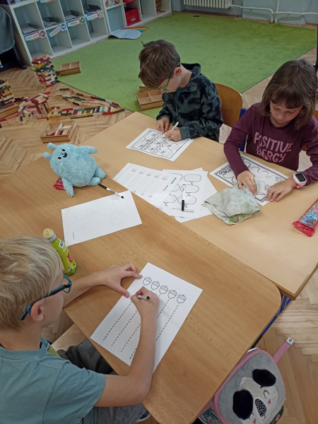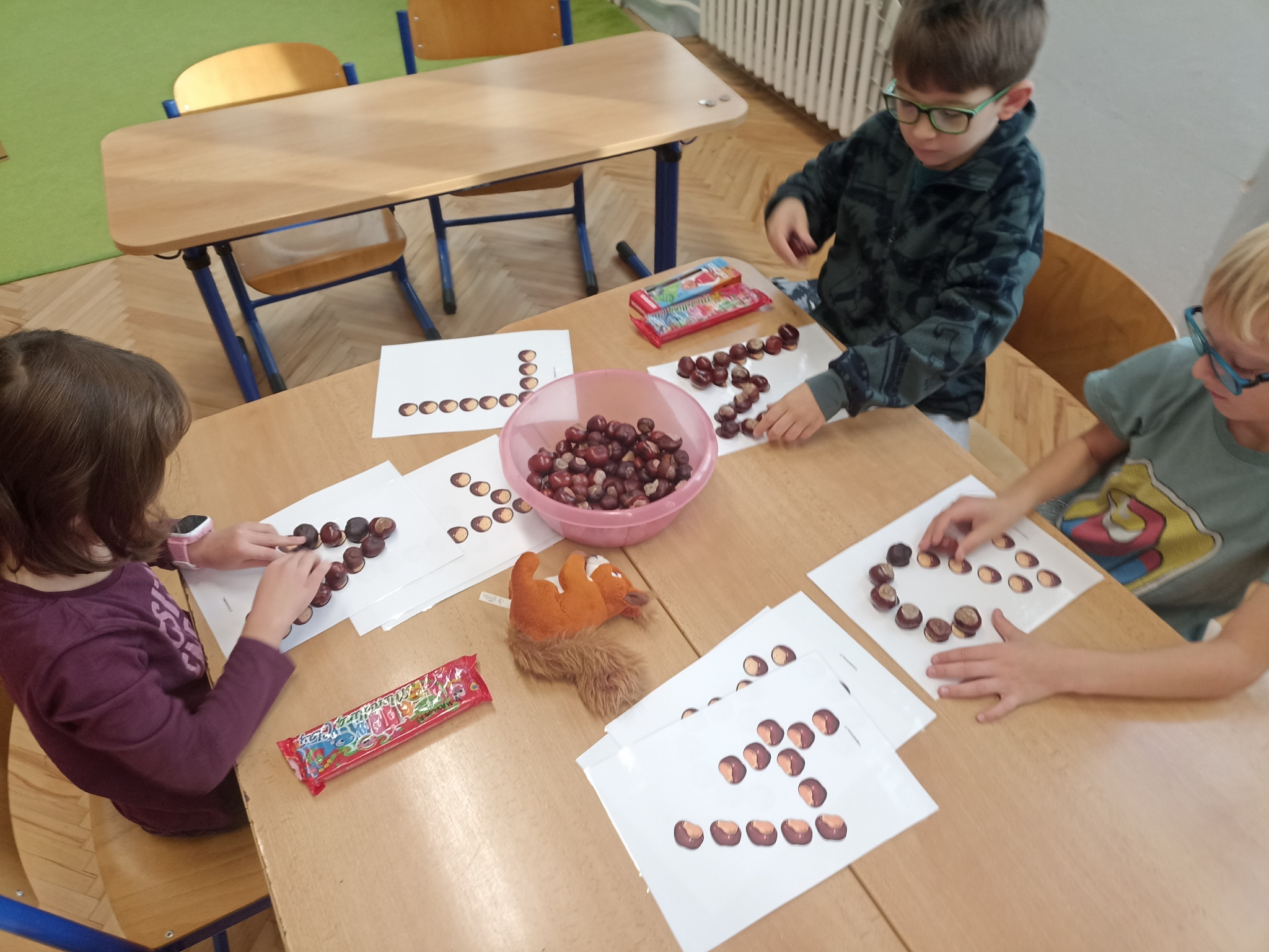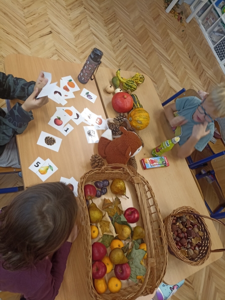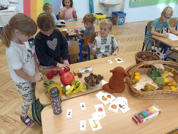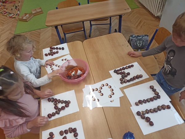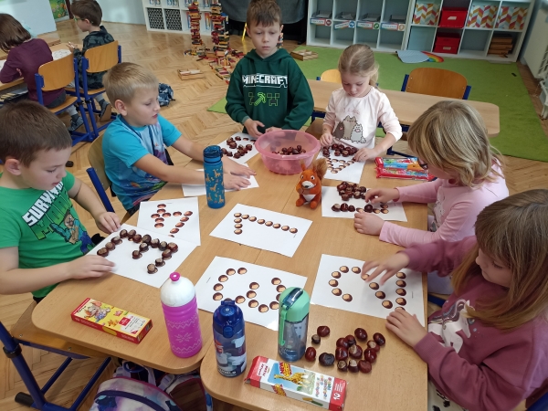 V první třídě jsme si užili podzimně laděné dopoledne. V centrech aktivit jsme pracovali na stanovištích se zvířátky - s veverkou jsme rozvíjeli jemnou motoriku skládáním kaštanů, s liškou jsme určovali množství podzimních objektů dle předlohy, s jezevcem tvořili podzimní plody z plastelíny a s Apu se zdokonalovali v grafomotorice. Ve skupinách jsme se hravou formou seznamovali s matematickými pojmy porovnávání a sčítání, trénovali programování s Bee-boty, přičemž jsme poznávali zpracování podzimního ovoce, opakovali roční období a nakonec si pochutnali na podzimním ovoci. Podzim nám tak ukázal, že učení může být stejně pestré a voňavé jako samotná podzimní příroda.