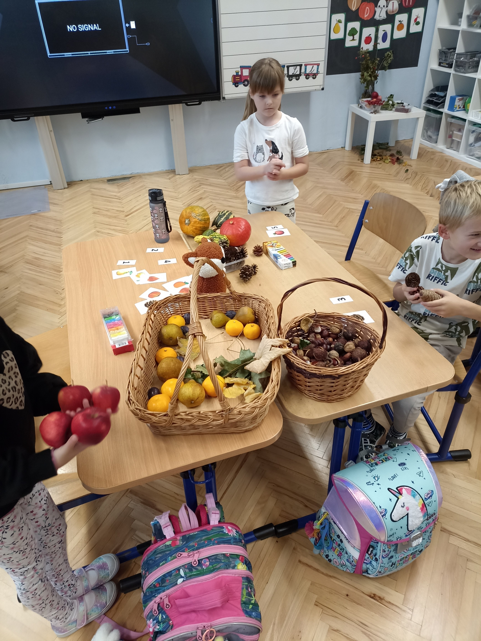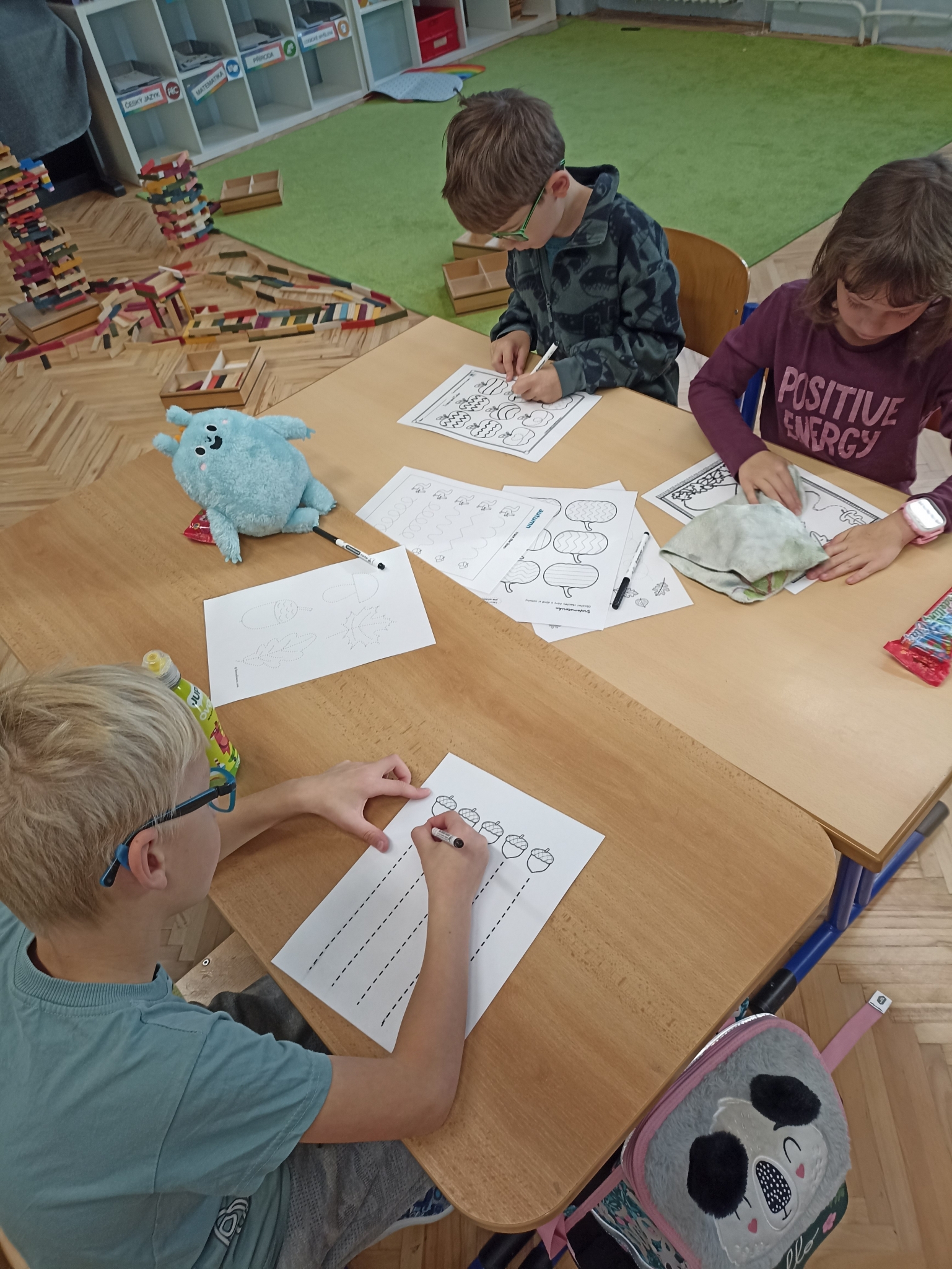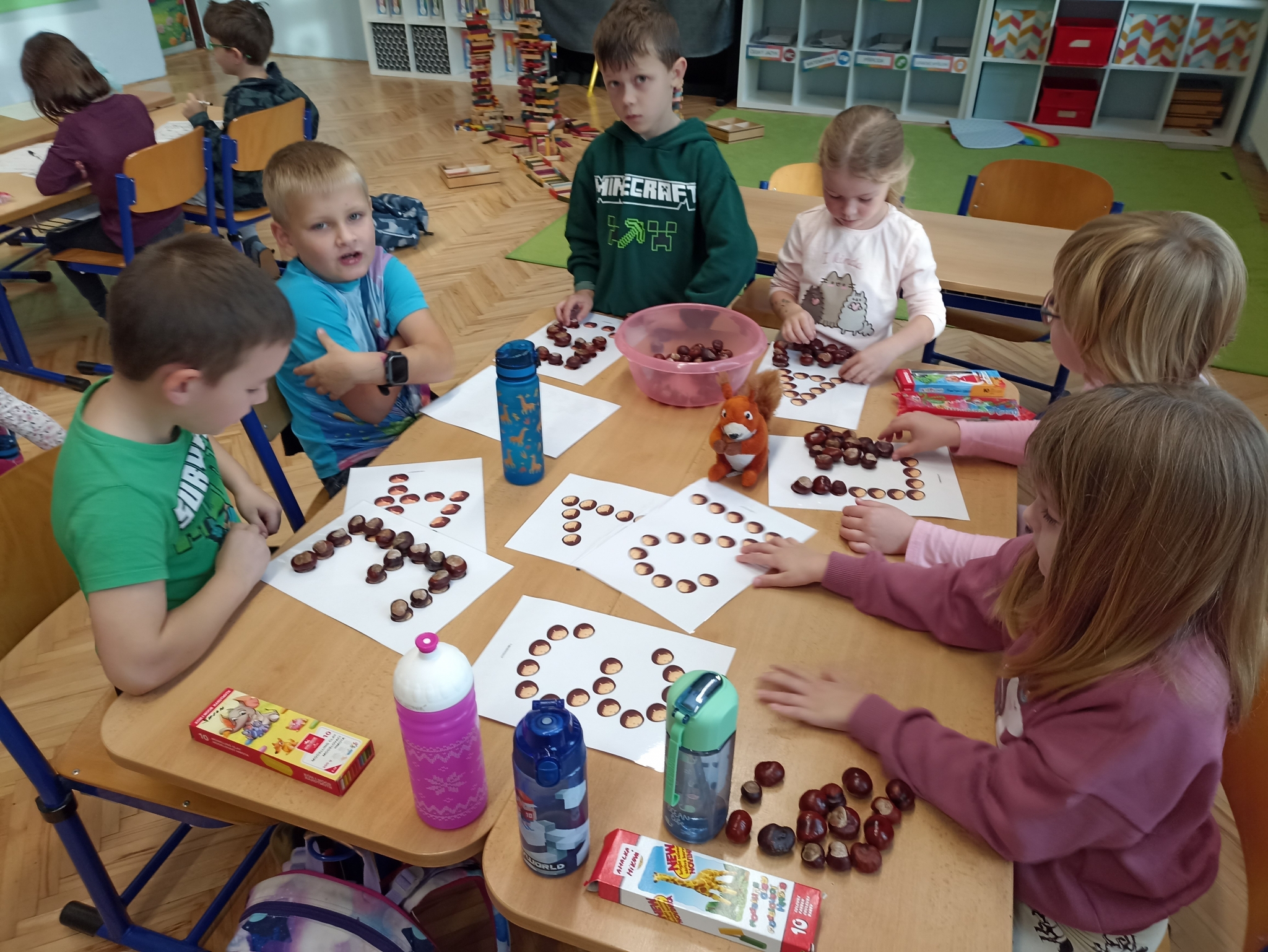 V první třídě jsme si užili podzimně laděné dopoledne. V centrech aktivit jsme pracovali na stanovištích se zvířátky - s veverkou jsme rozvíjeli jemnou motoriku skládáním kaštanů, s liškou jsme určovali množství podzimních objektů dle předlohy, s jezevcem tvořili podzimní plody z plastelíny a s Apu se zdokonalovali v grafomotorice. Ve skupinách jsme se hravou formou seznamovali s matematickými pojmy porovnávání a sčítání, trénovali programování s Bee-boty, přičemž jsme poznávali zpracování podzimního ovoce, opakovali roční období a nakonec si pochutnali na podzimním ovoci. Podzim nám tak ukázal, že učení může být stejně pestré a voňavé jako samotná podzimní příroda.