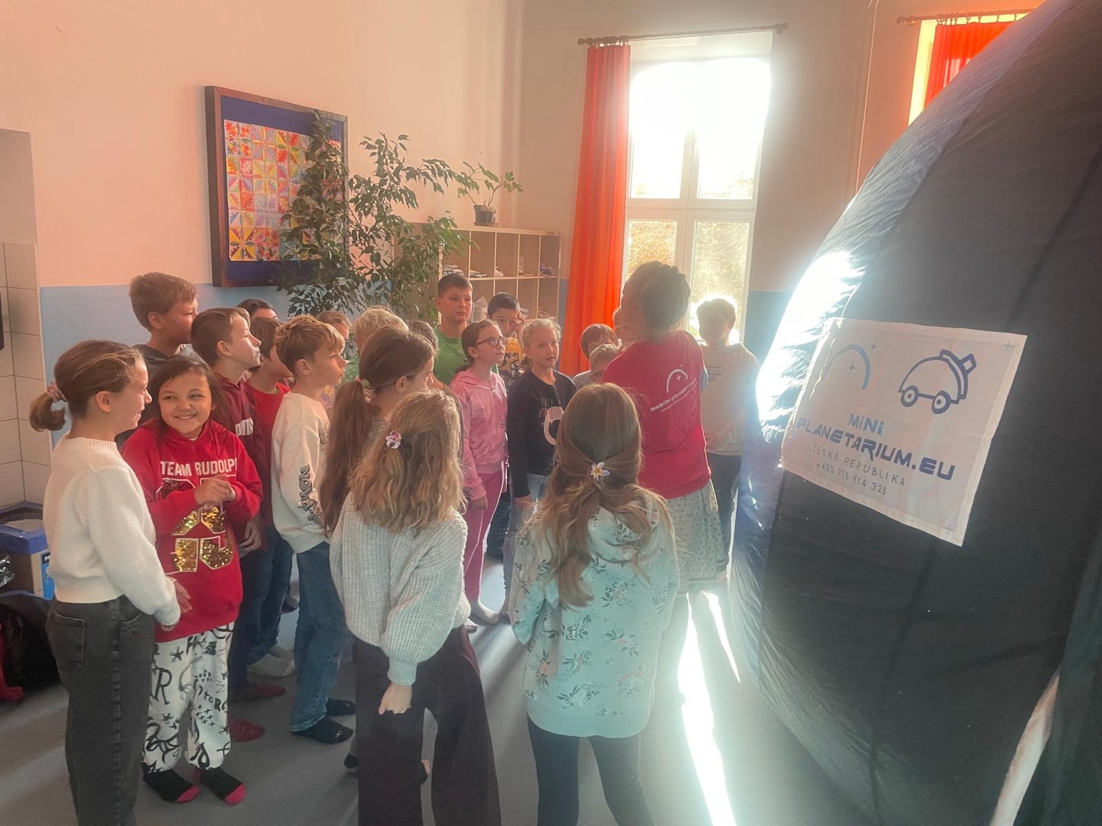 Ve středu 5. listopadu 2025 navštívilo naši školu mobilní planetárium, které pro žáky připravilo poutavé programy přizpůsobené jednotlivým ročníkům. Promítání probíhalo ve třídě, kde byla postavena velká nafukovací kopule, do které jsme vstupovali bez bot. Uvnitř nás čekala fascinující projekce na kopuli, která nás přenesla daleko za hranice běžné školní výuky.