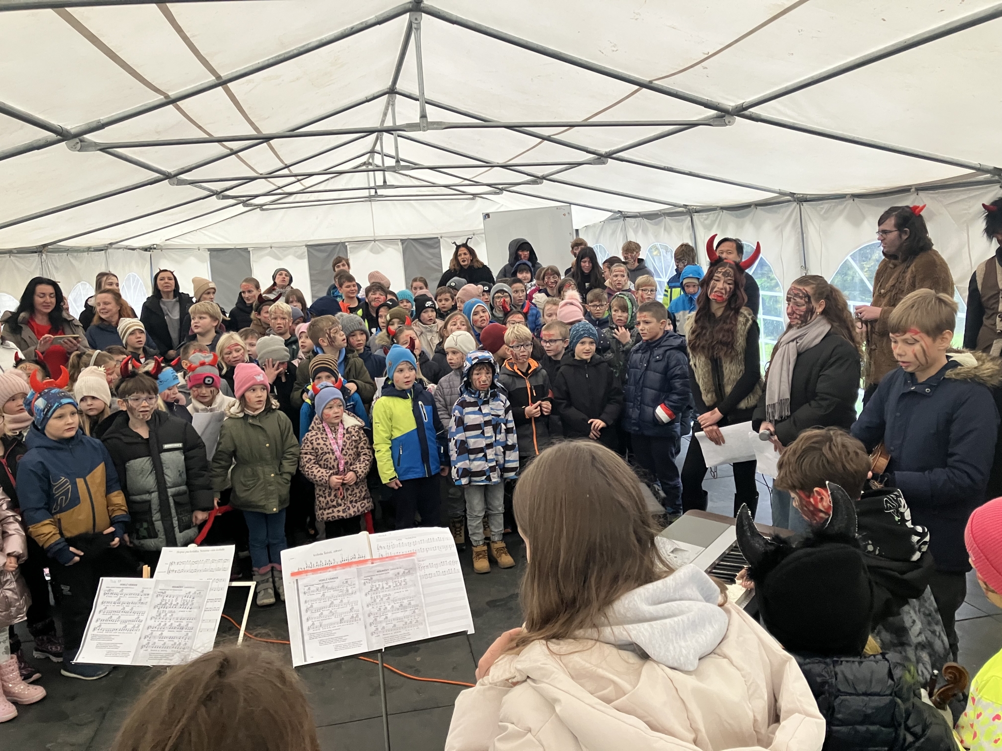 Celé zpívání se navíc konalo v den, kdy školou také symbolicky prošel Mikuláš. Díky našim deváťákům, kteří vytvořili ještě kouzelnější atmosféru. V kostýmech Mikuláše, andělů i čertů se připojili k programu a celé dopoledne krásně obohatili.