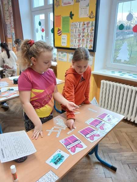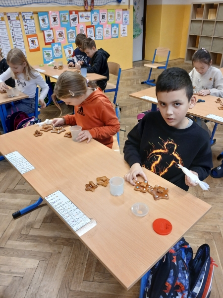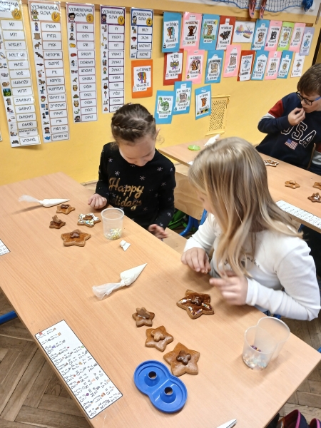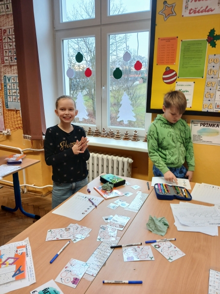 V předvánočním čase jsme si ve třídě připravili speciální projekt, který spojil zábavu s učením. Děti procvičovaly učivo matematiky a českého jazyka hravou formou – za splněné úkoly získávaly písmena, ze kterých pak složili slovo. Úkoly byly pestré: počítání, jazykové hádanky i logické úlohy, které děti nadšeně řešily. Součástí projektu byla také kreativní dílna, ve které jsme vyráběli stromečky z perníku. Děti si užily nejen tvoření, ale i vůni Vánoc, která se linula celou třídou. Společně jsme si tak vytvořili krásnou sváteční atmosféru.