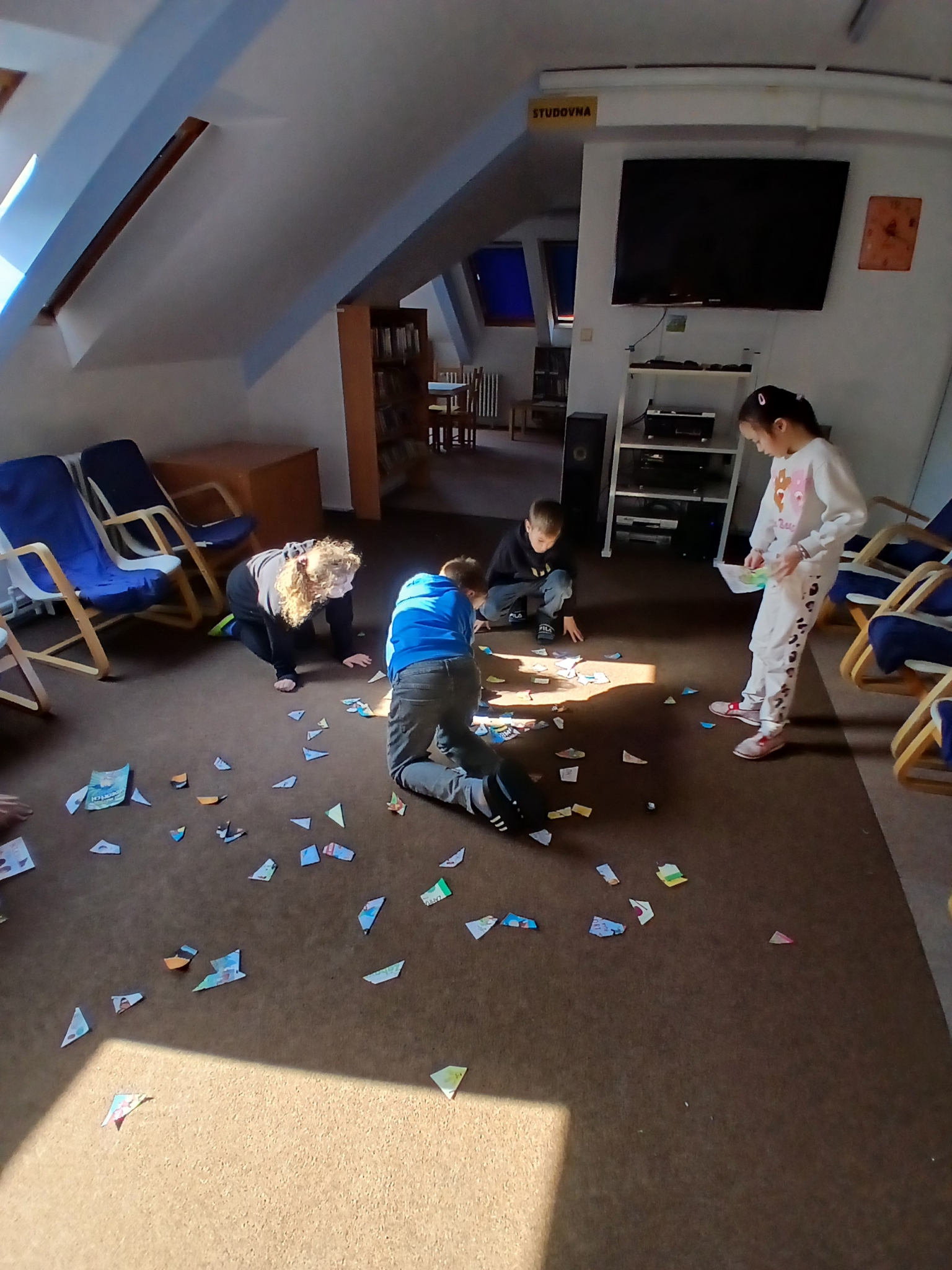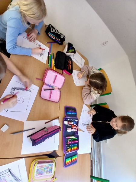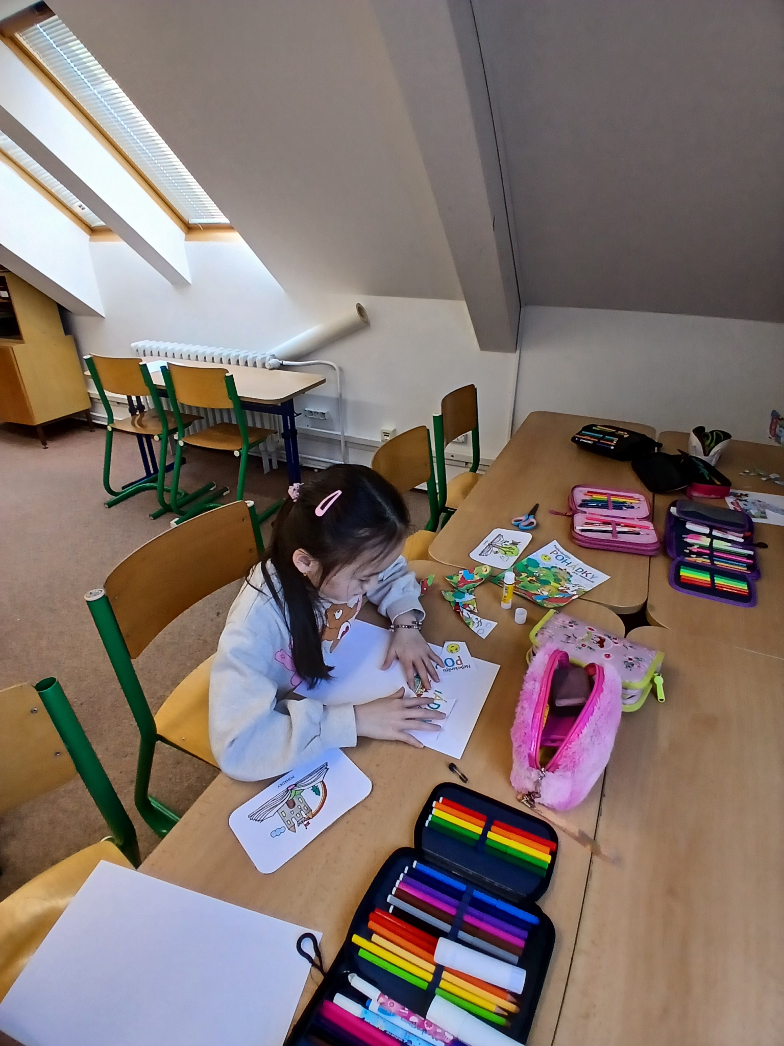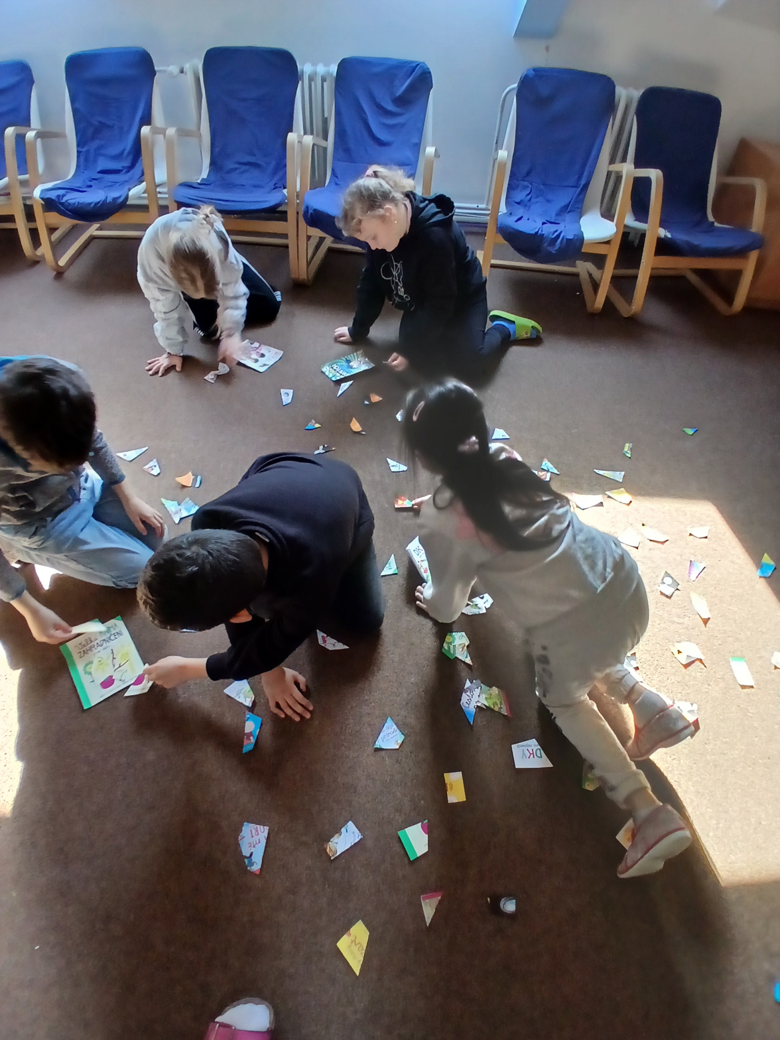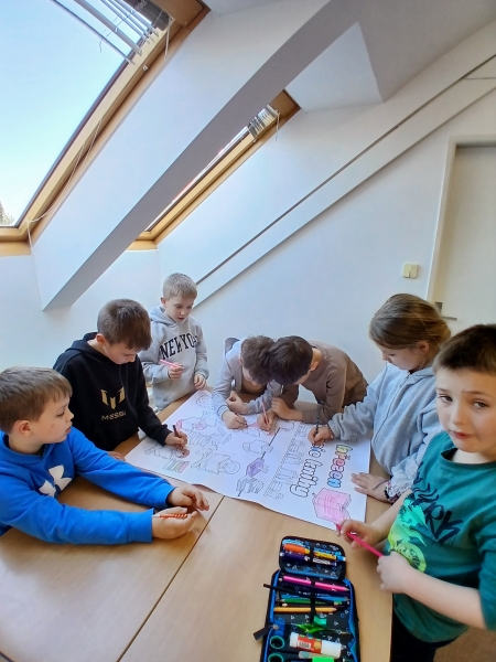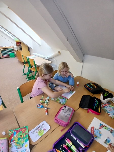 V ateliéru si děti vyzkoušely práci ilustrátorů – skládaly obálky knih, navrhovaly svou vlastní titulní stranu a vymýšlely vlastního knižního hrdinu. Společně vznikl i krásný kooperativní obrázek. ????✨