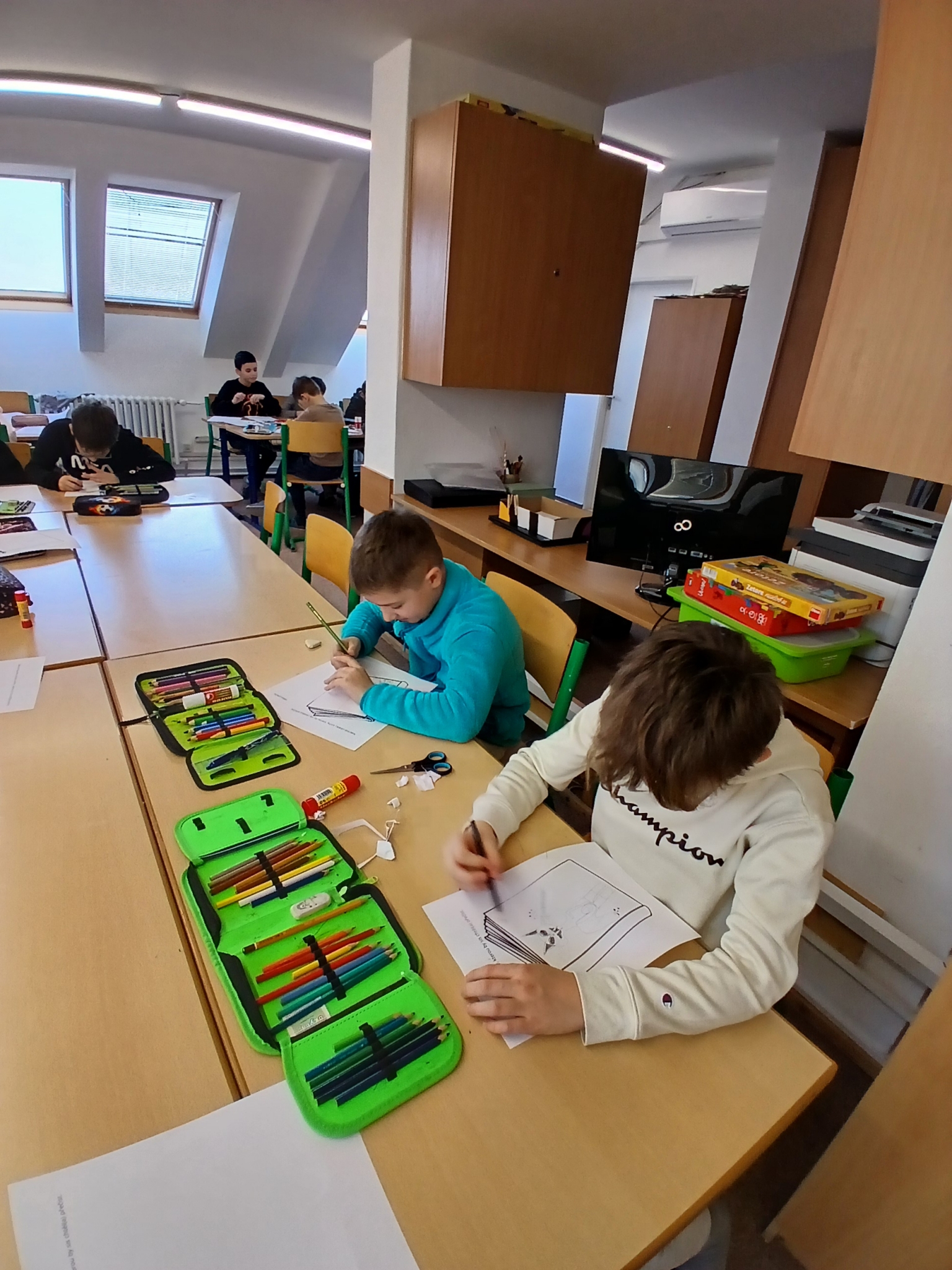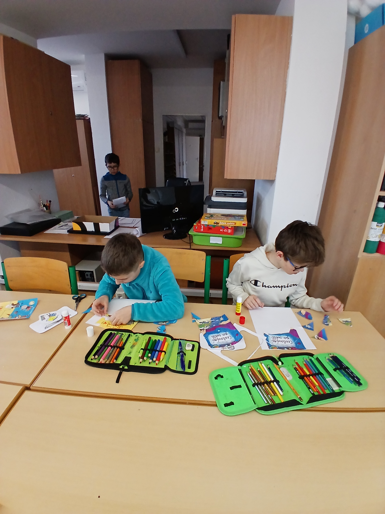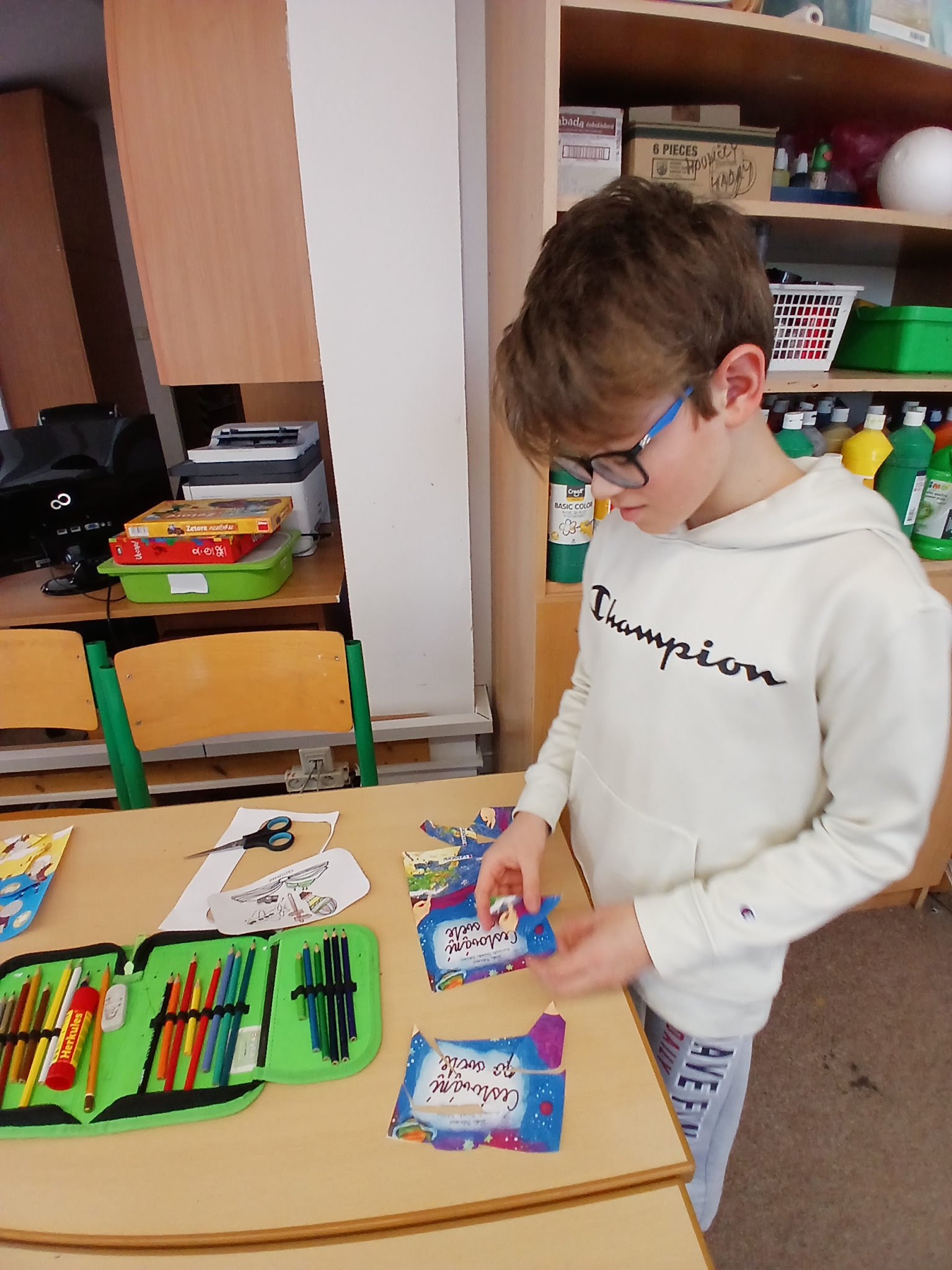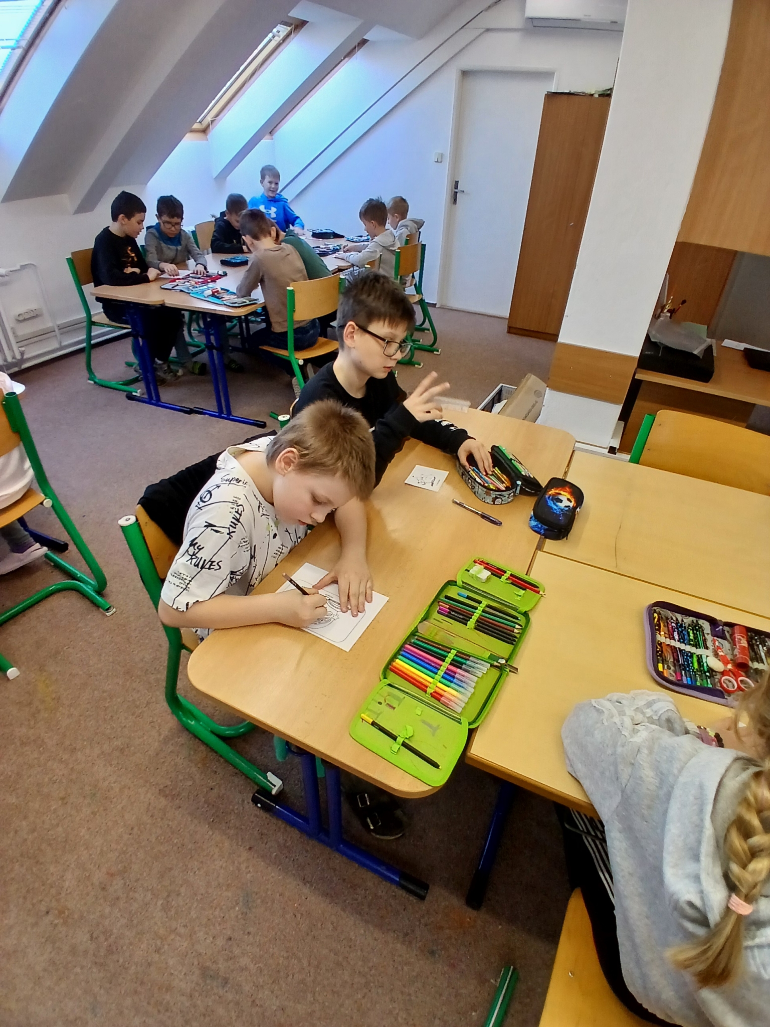 V ateliéru si děti vyzkoušely práci ilustrátorů – skládaly obálky knih, navrhovaly svou vlastní titulní stranu a vymýšlely vlastního knižního hrdinu. Společně vznikl i krásný kooperativní obrázek. ????✨
