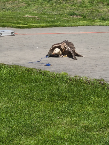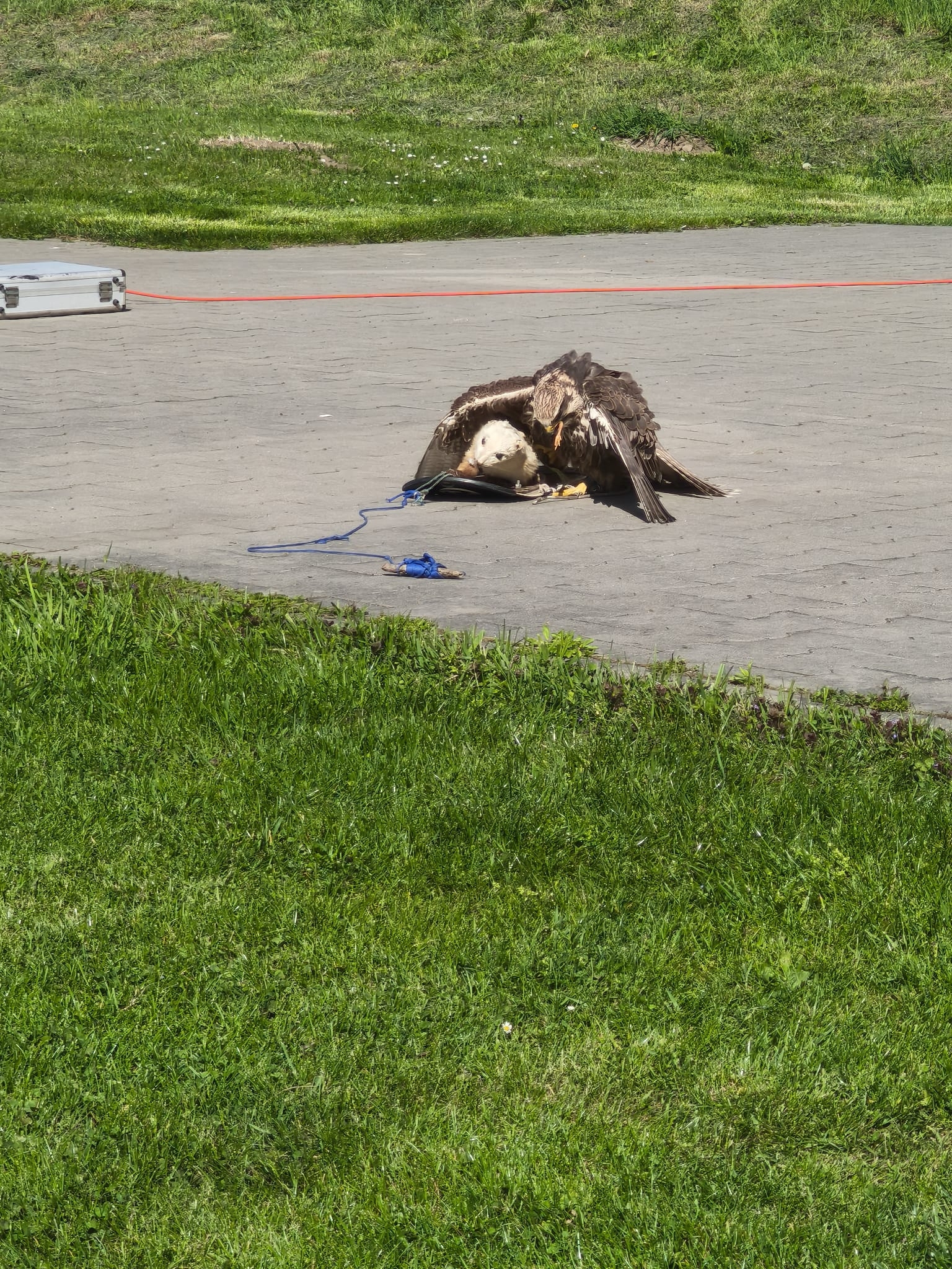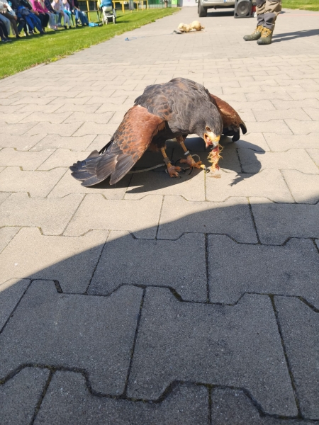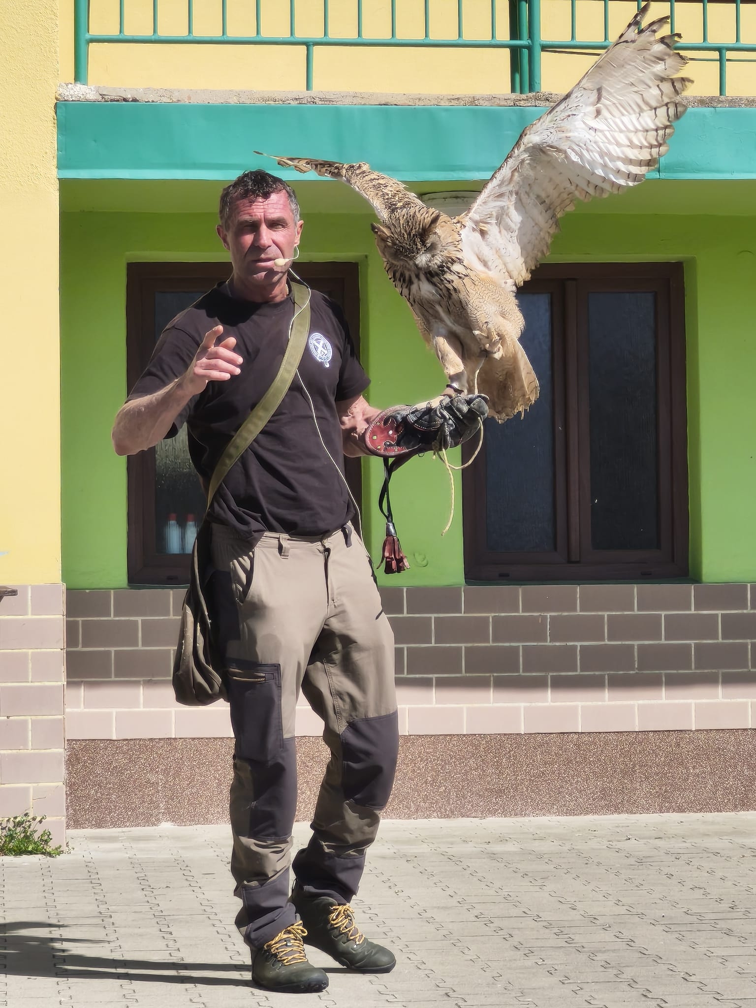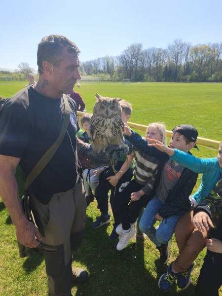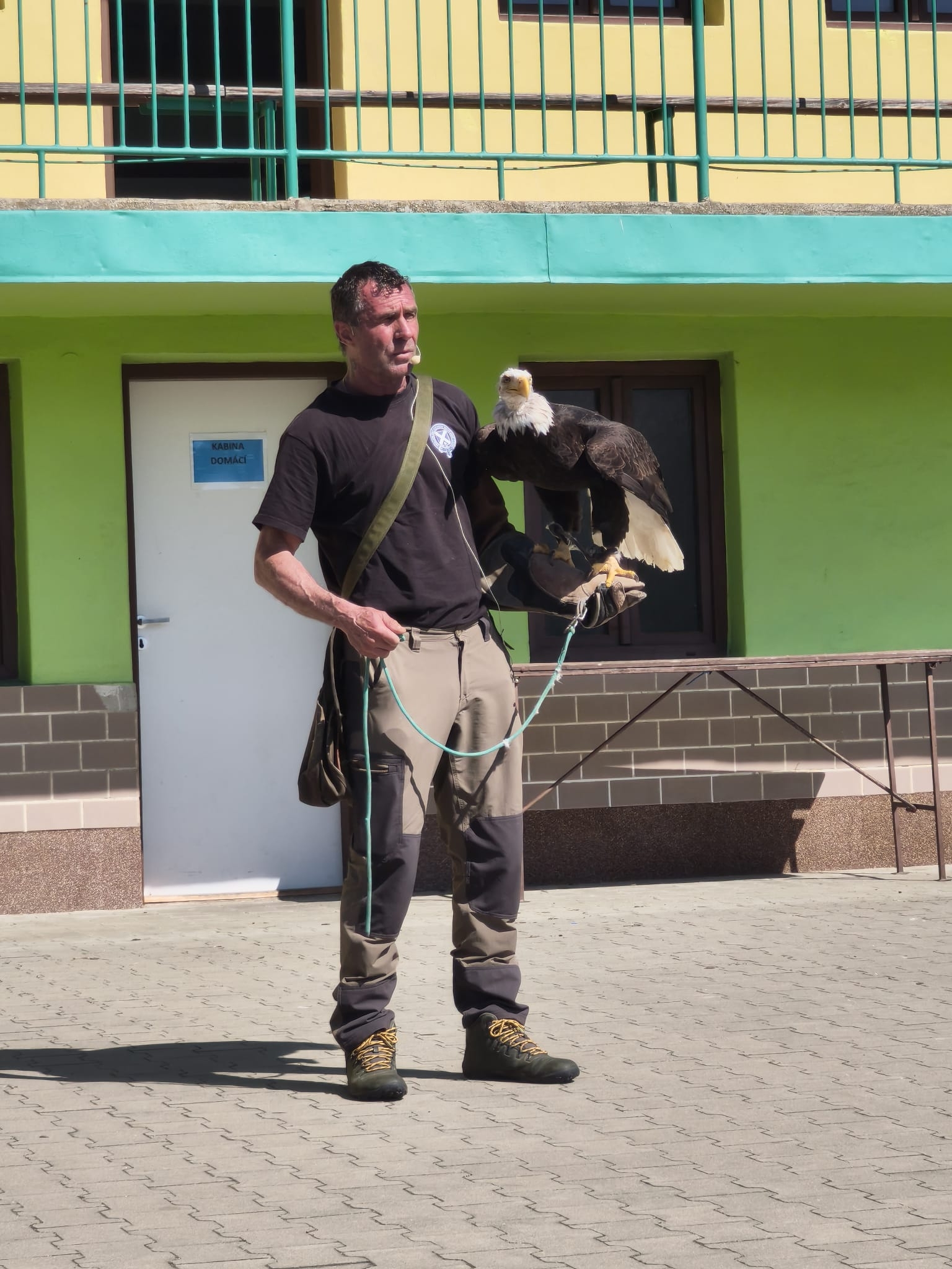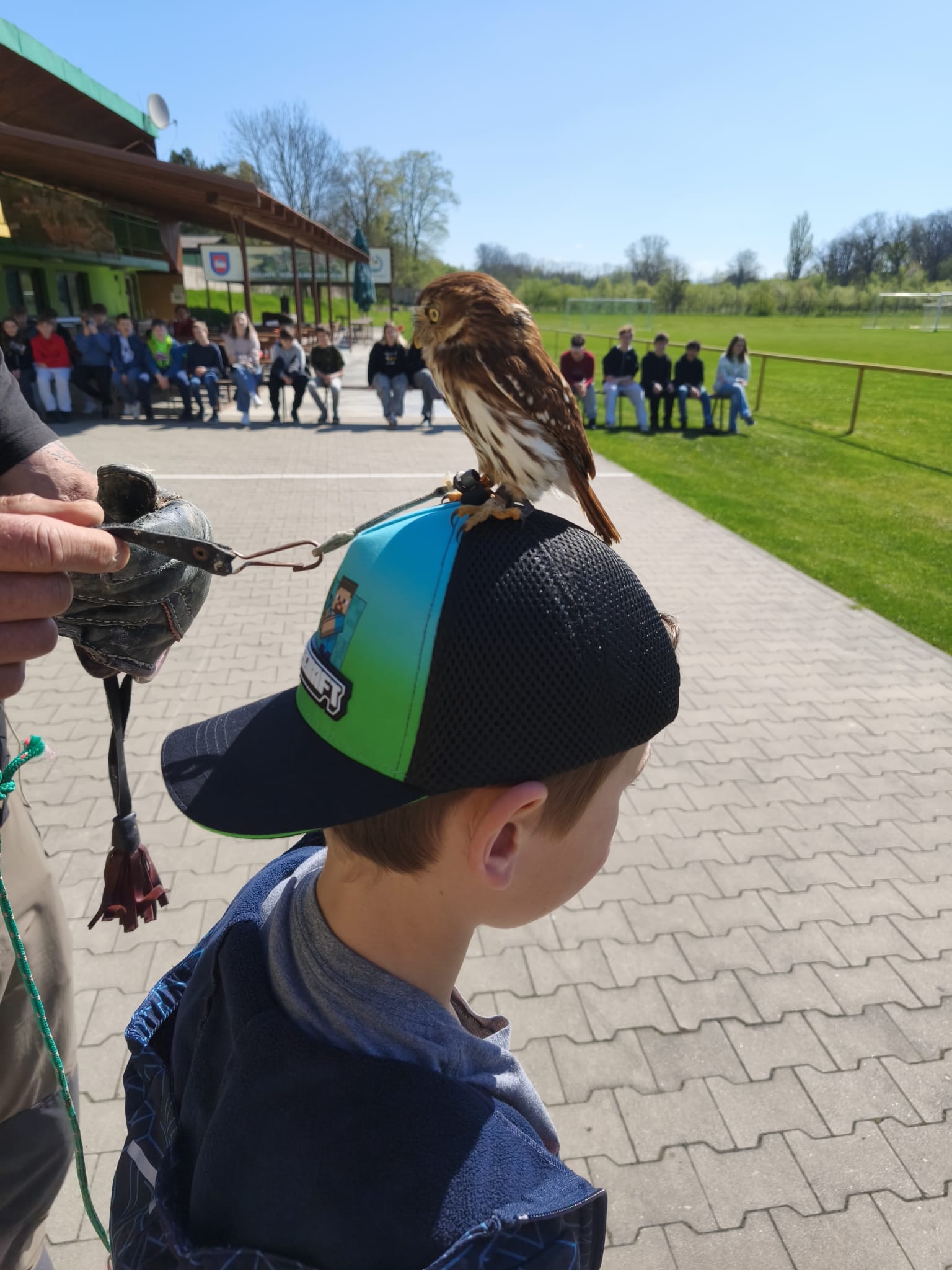 Celá akce proběhla na fotbalovém hřišti, kde se sešla celá škola – a bylo se opravdu na co dívat! Vancos nám představil řadu dravých ptáků – od sov a jestřábů až po majestátní orly – a poutavě přiblížil jejich život, způsob lovu i výcvik.
